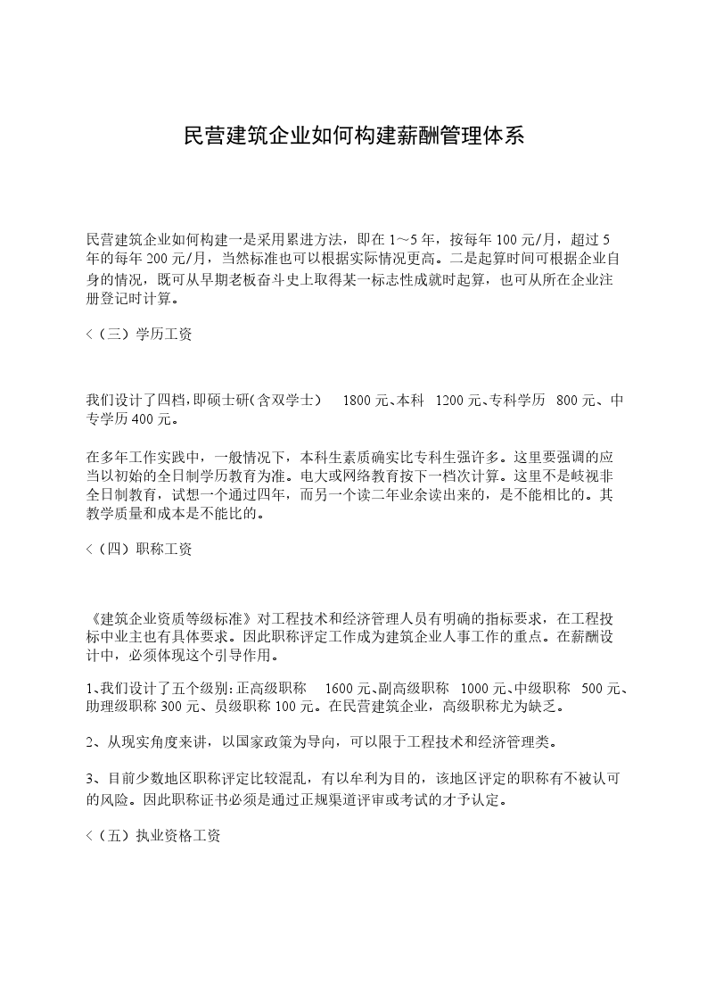 <(五)执业资格工资执业资格对建筑企业的重要性是不言而喻,尤其是注册建造师更是建筑企业的基石。因此,在设计薪酬体系时必须方向明确,措施得力,重奖之下必有勇夫。