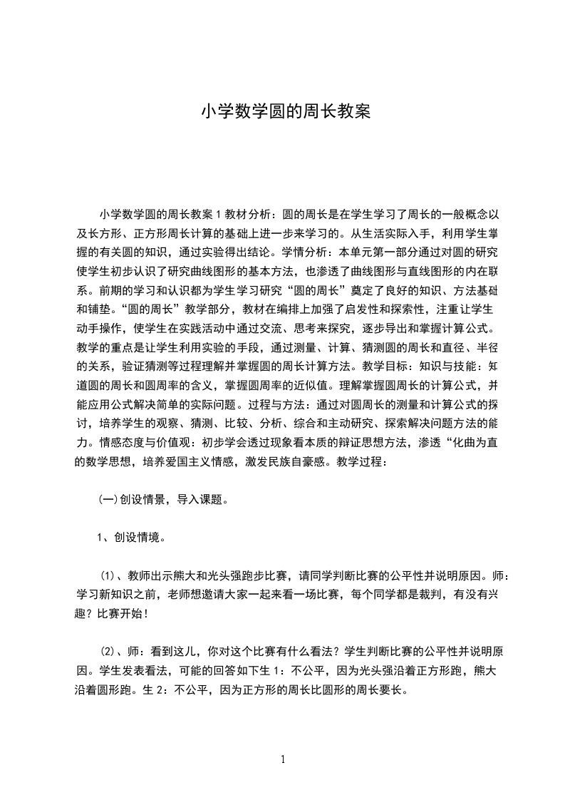 小学数学圆的周长教案1教材分析:圆的周长是在学生学习了周长的一般概念以及长方形、正方形周长计算的基础上进一步来学习的。从生活实际入手,利用学生掌握的有关圆的知识,通过实验得出结论。学情分析:本单元第一部分通过对圆的研究,使学生初步认识了研究曲线图形的基本方法,也渗透了曲线图形与直线图形的内在联系。前期的学习和认识都为学生学习研究“圆的周长”奠定了良好的知识、方法基础和铺垫。“圆的周长”教学部分,教材在编排上加强了启发性和探索性,注重让学生动手操作,使学生在实践活动中通过交流、思考来探究,逐步导出和掌握计算公式。教学的重点是让学生利用实验的手段,通过测量、计算、猜测圆的周长和直径、半径的关系,验证猜测等过程理解并掌握圆的周长计算方法。教学目标:知识与技能:知道圆的周长和圆周率的含义,掌握圆周率的近似值。理解掌握圆周长的计算公式,并能应用公式解决简单的实际问题。过程与方法:通过对圆周长的测量和计算公式的探讨,培养学生的观察、猜测、比较、分析、综合和主动研究、探索解决问题方法的能力。情感态度与价值观:初步学会透过现象看本质的辩证思想方法,渗透“化曲为直”的数学思想,培养爱国主义情感,激发民族自豪感。教学过程: