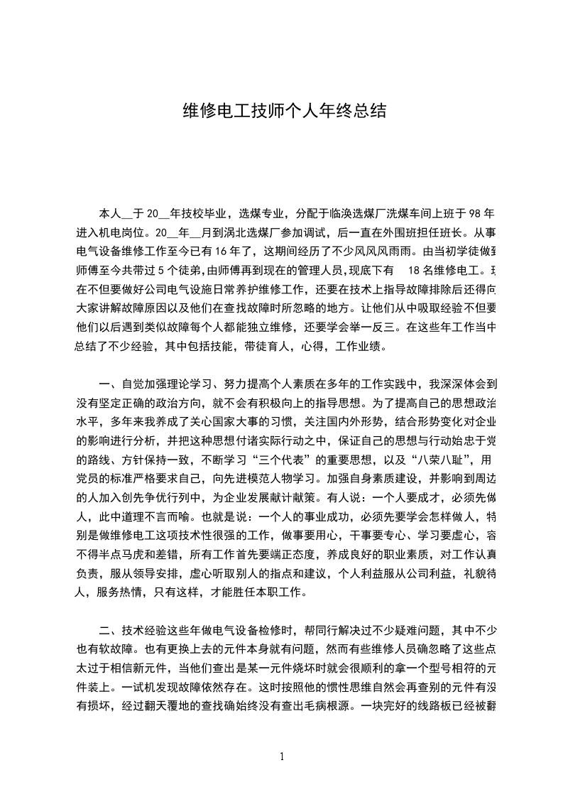 一、自觉加强理论学习、努力提高个人素质在多年的工作实践中,我深深体会到没有坚定正确的政治方向,就不会有积极向上的指导思想。为了提高自己的思想政治水平,多年来我养成了关心国家大事的习惯,关注国内外形势,结合形势变化对企业的影响进行分析,并把这种思想付诸实际行动之中,保证自己的思想与行动始忠于党的路线、方针保持一致,不断学习“三个代表”的重要思想,以及“八荣八耻”,用党员的标准严格要求自己,向先进模范人物学习。加强自身素质建设,并影响到周边的人加入创先争优行列中,为企业发展献计献策。有人说:一个人要成才,必须先做人,此中道理不言而喻。也就是说:一个人的事业成功,必须先要学会怎样做人,特别是做维修电工这项技术性很强的工作,做事要用心,干事要专心、学习要虚心,容不得半点马虎和差错,所有工作首先要端正态度,养成良好的职业素质,对工作认真负责,服从领导安排,虚心听取别人的指点和建议,个人利益服从公司利益,礼貌待人,服务热情,只有这样,才能胜任本职工作。