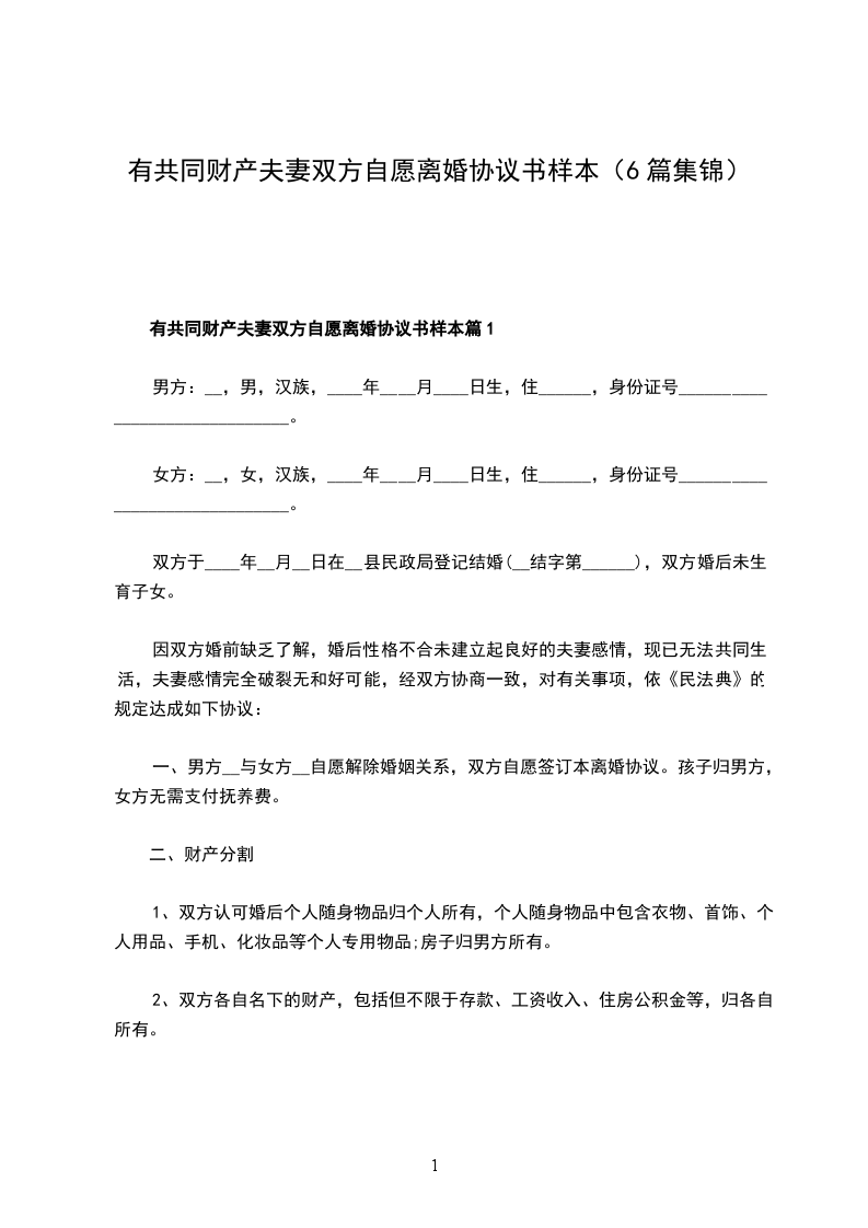 有共同财产夫妻双方自愿离婚协议书样本篇1