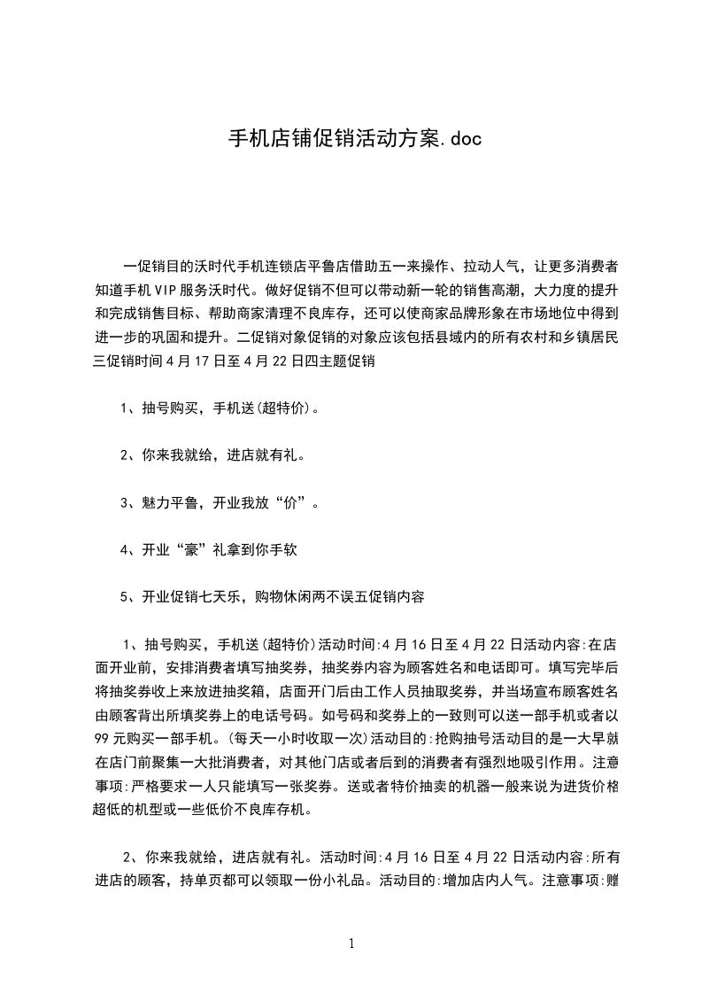 1、抽号购买,手机送(超特价)活动时间:4月16日至4月22日活动内容:在店面开业前,安排消费者填写抽奖券,抽奖券内容为顾客姓名和电话即可。填写完毕后将抽奖券收上来放进抽奖箱,店面开门后由工作人员抽取奖券,并当场宣布顾客姓名,由顾客背出所填奖券上的电话号码。如号码和奖券上的一致则可以送一部手机或者以99元购买一部手机。(每天一小时收取一次)活动目的:抢购抽号活动目的是一大早就在店门前聚集一大批消费者,对其他门店或者后到的消费者有强烈地吸引作用。注意事项:严格要求一人只能填写一张奖券。送或者特价抽卖的机器一般来说为进货价格超低的机型或一些低价不良库存机。