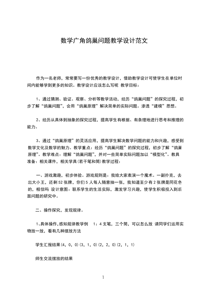 3、通过“鸽巢原理”的灵活应用,提高学生解决数学问题的能力和兴趣,感受到数学文化及数学的魅力。教学重点:经历“鸽巢问题”的探究过程,初步了解“鸽巢原理”。教学难点:理解“鸽巢问题”,并对一些简单实际问题加以“模型化”。教具准备:相关课件,相关学具(若干笔和筒)教学过程: