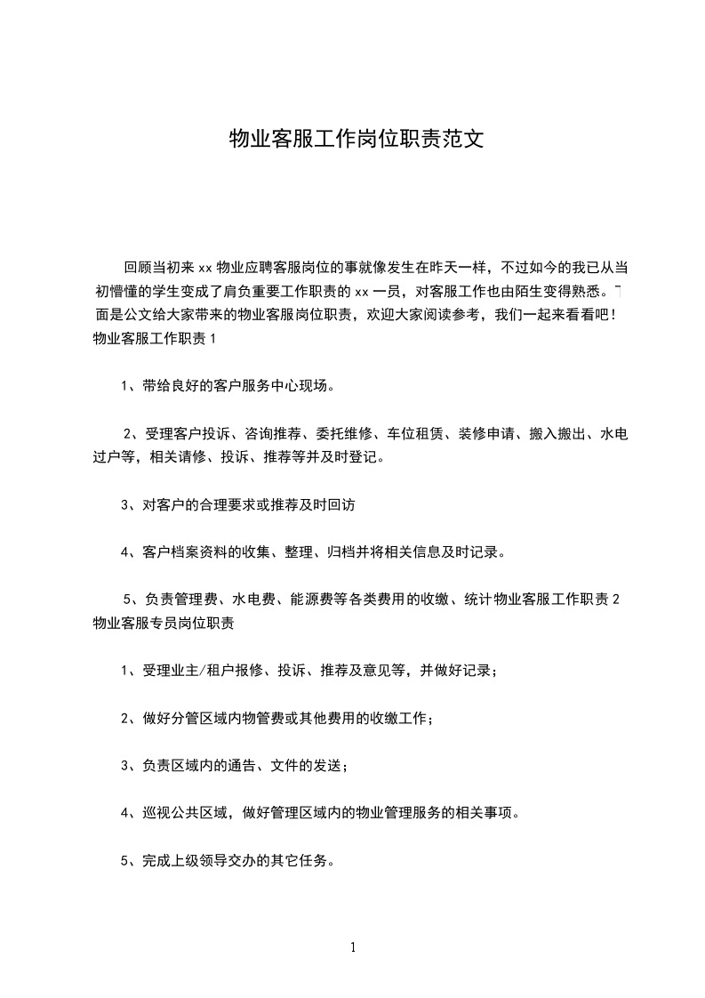 回顾当初来xx物业应聘客服岗位的事就像发生在昨天一样,不过如今的我已从当初懵懂的学生变成了肩负重要工作职责的xx一员,对客服工作也由陌生变得熟悉。下面是公文给大家带来的物业客服岗位职责,欢迎大家阅读参考,我们一起来看看吧!物业客服工作职责1
