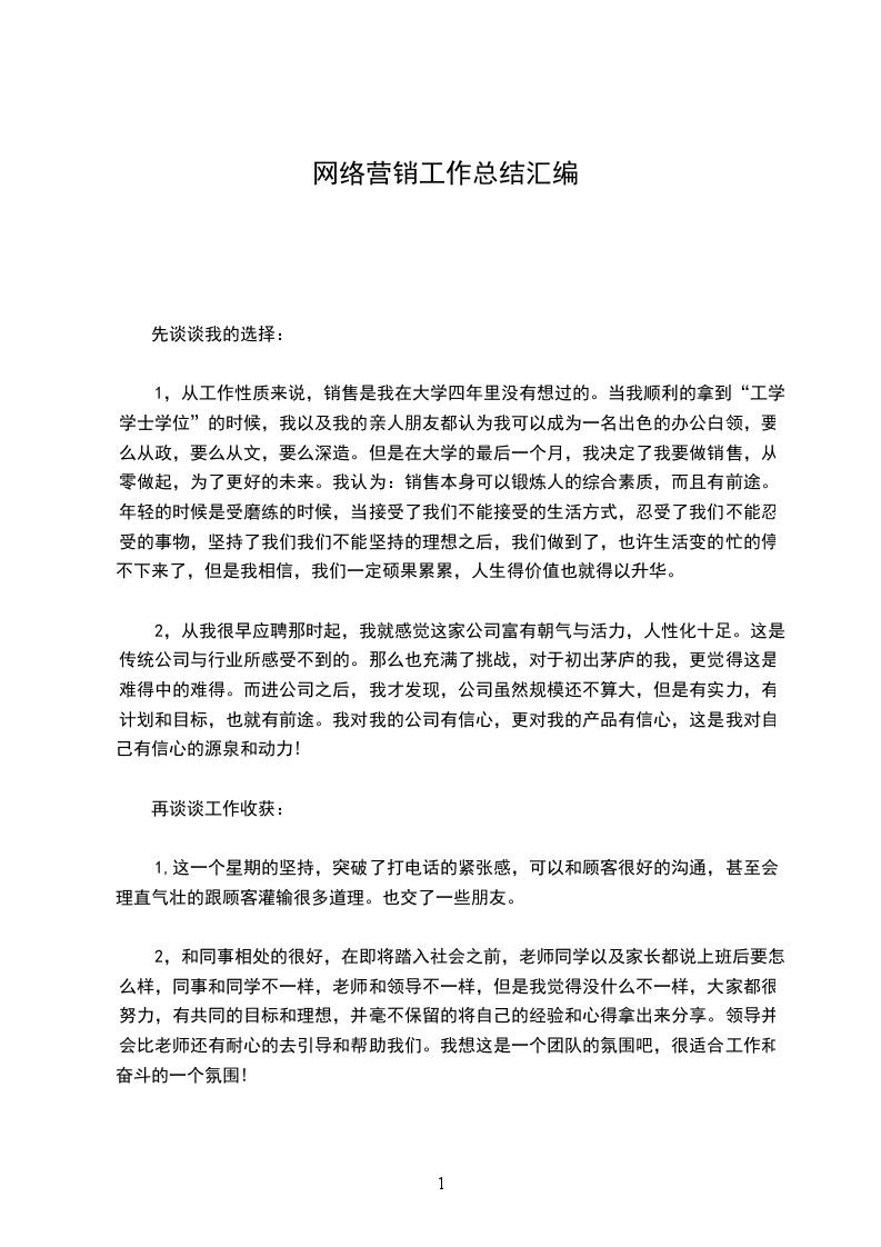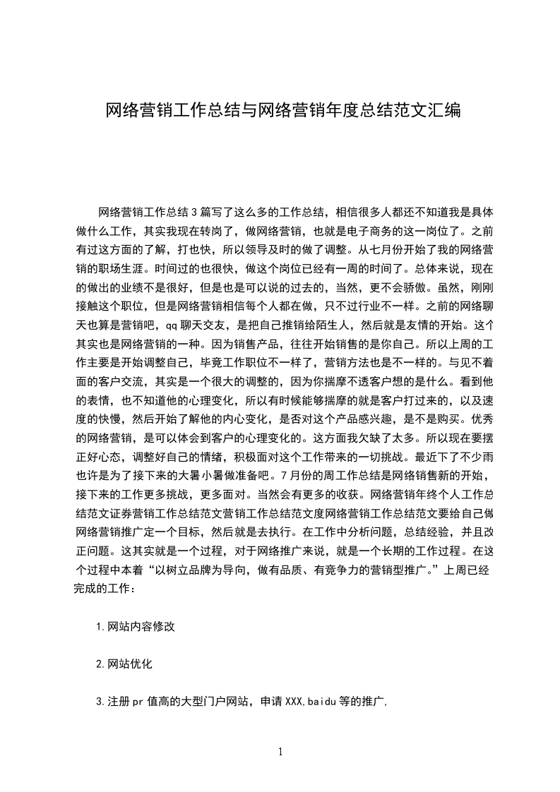 网络营销工作总结3篇写了这么多的工作总结,相信很多人都还不知道我是具体做什么工作,其实我现在转岗了,做网络营销,也就是电子商务的这一岗位了。之前有过这方面的了解,打也快,所以领导及时的做了调整。从七月份开始了我的网络营销的职场生涯。时间过的也很快,做这个岗位已经有一周的时间了。总体来说,现在的做出的业绩不是很好,但是也是可以说的过去的,当然,更不会骄傲。虽然,刚刚接触这个职位,但是网络营销相信每个人都在做,只不过行业不一样。之前的网络聊天也算是营销吧,qq聊天交友,是把自己推销给陌生人,然后就是友情的开始。这个其实也是网络营销的一种。因为销售产品,往往开始销售的是你自己。所以上周的工作主要是开始调整自己,毕竟工作职位不一样了,营销方法也是不一样的。与见不着面的客户交流,其实是一个很大的调整的,因为你揣摩不透客户想的是什么。看到他的表情,也不知道他的心理变化,所以有时候能够揣摩的就是客户打过来的,以及速度的快慢,然后开始了解他的内心变化,是否对这个产品感兴趣,是不是购买。优秀的网络营销,是可以体会到客户的心理变化的。这方面我欠缺了太多。所以现在要摆正好心态,调整好自己的情绪,积极面对这个工作带来的一切挑战。最近下了不少雨,也许是为了接下来的大暑小暑做准备吧。7月份的周工作总结是网络销售新的开始,接下来的工作更多挑战,更多面对。当然会有更多的收获。网络营销年终个人工作总结范文证券营销工作总结范文营销工作总结范文度网络营销工作总结范文要给自己做网络营销推广定一个目标,然后就是去执行。在工作中分析问题,总结经验,并且改正问题。这其实就是一个过程,对于网络推广来说,就是一个长期的工作过程。在这个过程中本着“以树立品牌为导向,做有品质、有竞争力的营销型推广。”上周已经完成的工作: