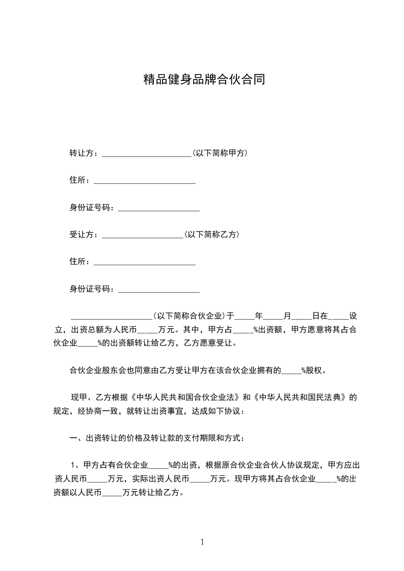 1、甲方占有合伙企业_____%的出资,根据原合伙企业合伙人协议规定,甲方应出资人民币_____万元,实际出资人民币_____万元。现甲方将其占合伙企业_____%的出资额以人民币_____万元转让给乙方。