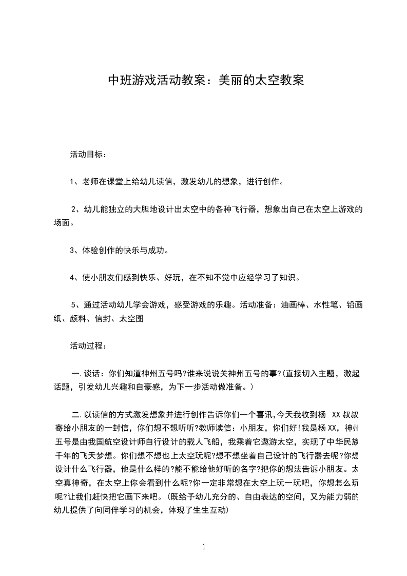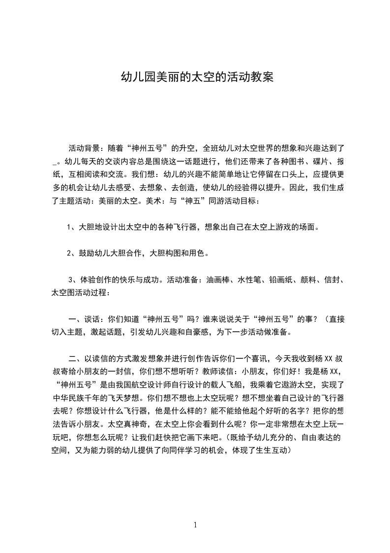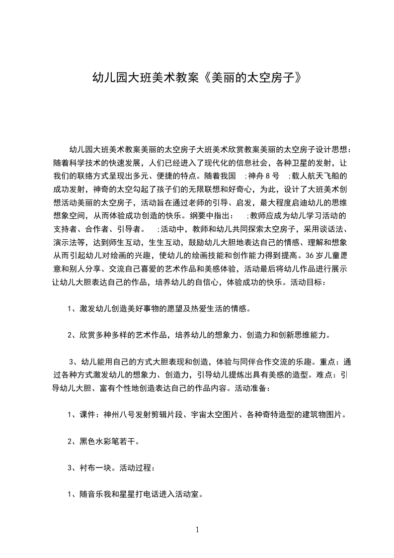 幼儿园大班美术教案美丽的太空房子大班美术欣赏教案美丽的太空房子设计思想:随着科学技术的快速发展,人们已经进入了现代化的信息社会,各种卫星的发射,让我们的联络方式呈现出多元、便捷的特点。随着我国 ;神舟8号 ;载人航天飞船的成功发射,神奇的太空勾起了孩子们的无限联想和好奇心,为此,设计了大班美术创想活动美丽的太空房子,活动旨在通过老师的引导、启发,最大程度启迪幼儿的思维想象空间,从而体验成功创造的快乐。纲要中指出: ;教师应成为幼儿学习活动的支持者、合作者、引导者。 ;活动中,教师和幼儿共同探索太空房子,采用谈话法、演示法等,达到师生互动,生生互动,鼓励幼儿大胆地表达自己的情感、理解和想象,从而引起幼儿对绘画的兴趣,使幼儿的绘画技能和创作能力得到提高。36岁儿童愿意和别人分享、交流自己喜爱的艺术作品和美感体验,活动最后将幼儿作品进行展示,让幼儿大胆表达自己的作品,培养幼儿的自信心,体验成功的快乐。活动目标: