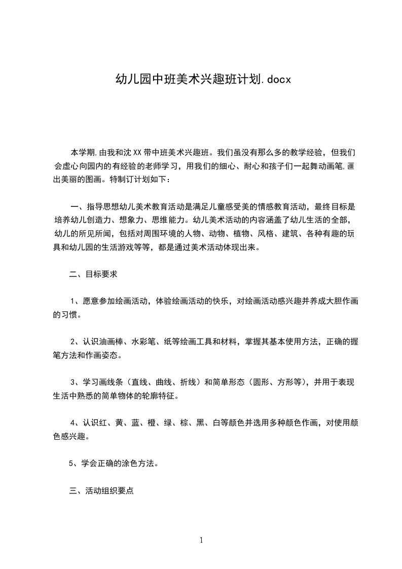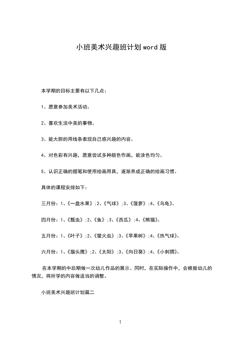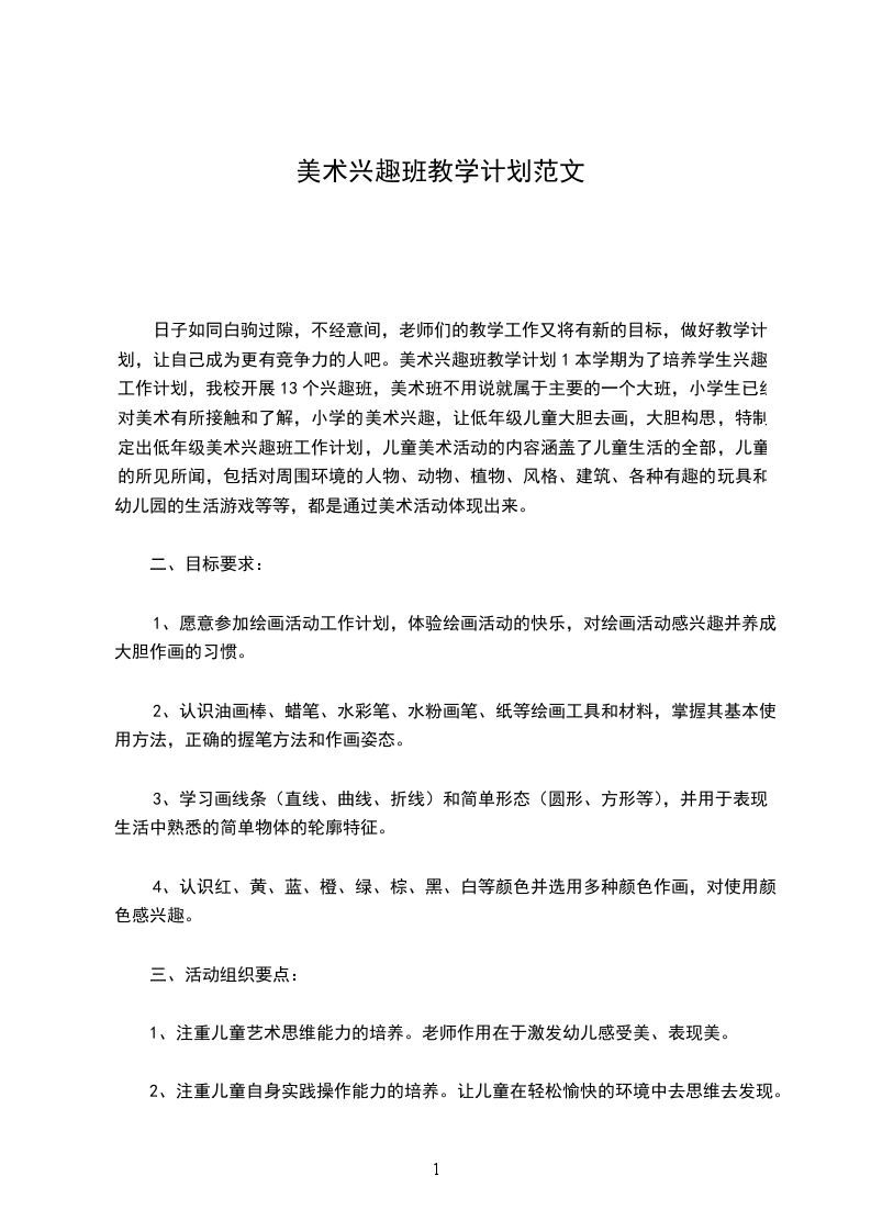 (2)本兴趣班幼儿的基本情况本班幼儿年龄偏小,考虑到这个原因,本学期主要以培养幼儿良好的作画习惯及激发幼儿对美术的初步兴趣为主要目的。运用看看、做做、玩玩的方法,引导和帮助幼儿由没有习惯到有习惯,有不清楚到清楚,能辨别红、绿、黄、蓝等基本颜色,基本分辩上、下空间方位,知道用点、竖线、横线、斜线圆形和涂染的方法画出熟悉的简单物体,使幼儿从不会画到会画,从不愿意画到愿意画最后到想画。