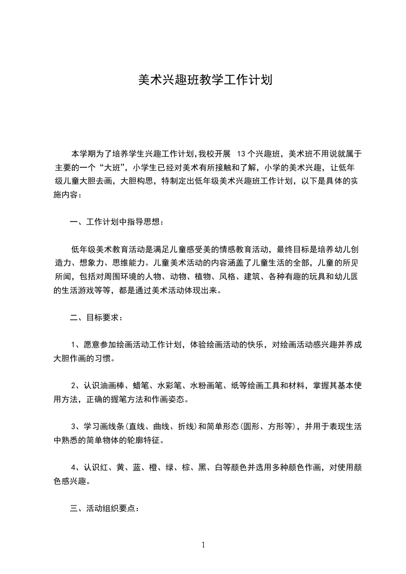 日子如同白驹过隙,不经意间,老师们的教学工作又将有新的目标,做好教学计划,让自己成为更有竞争力的人吧。美术兴趣班教学计划1本学期为了培养学生兴趣工作计划,我校开展13个兴趣班,美术班不用说就属于主要的一个大班,小学生已经对美术有所接触和了解,小学的美术兴趣,让低年级儿童大胆去画,大胆构思,特制定出低年级美术兴趣班工作计划,儿童美术活动的内容涵盖了儿童生活的全部,儿童的所见所闻,包括对周围环境的人物、动物、植物、风格、建筑、各种有趣的玩具和幼儿园的生活游戏等等,都是通过美术活动体现出来。