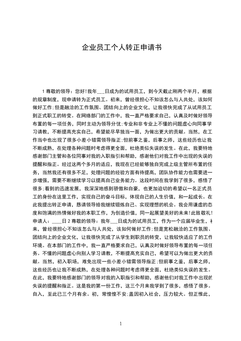 1尊敬的领导:您好!我年___日成为的试用员工,到今天截止刚两个半月,根据的规章制度,现申请转为正式员工。初来,曾经很担心不知该怎么与人共处,该如何做好工作;但是融洽的工作氛围、团结向上的企业文化,让我很快完成了从试用员工到正式职工的转变。在网络部门的工作中,我一直严格要求自己,认真及时做好领导布置的每一项任务,同时主动为领导分忧;专业和非专业上不懂的问题虚心向同事学习请教,不断提高充实自己,希望能尽早独当一面,为做出更大的贡献。当然,在工作当中也出现了很多小差小错需领导指正;但前事之鉴,后事之师,这些经历也让我不断成熟,在处理各种问题时考虑得更全面,杜绝类似失误的发生。在此,我要特地感谢部门主管和各位同事对我的入职指引和帮助,感谢他们对我工作中出现的失误的提醒和指正。经过这两个多月的适应,我现在已经能够独自完成上级主管所布置的任务,当然我还有很多不足,处理问题的经验方面有待提高,团队协作能力也需要进一步增强,需要不断继续学习以提高自己业务能力。这段时间在我学到了很多,感悟了很多;看到的迅速发展,我深深地感到骄傲和自豪,也更加迫切的希望以一名正式员工的身份在这里工作,实现自己的奋斗目标,体现自己的人生价值,和一起成长。在此我提出转正申请,恳请领导给我继续锻炼自己、实现理想的机会。我会用谦虚的态度和饱满的热情做好我的本职工作,为创造价值,同一起展望美好的未来!此致敬礼!申请人:____日2尊敬的领导:我年___日成为的试用员工,作为一个应届毕业生,初来,曾经很担心不知该怎么与人共处,该如何做好工作;但是宽松融洽的工作氛围、团结向上的企业文化,让我很快完成了从学生到职员的转变,让我较快适应了的工作环境。在本部门的工作中,我一直严格要求自己,认真及时做好领导布置的每一项任务。不懂的问题虚心向别人学习请教,不断提高充实自己,希望可以为做出更大的贡献。当然,初入职场,难免出现一些小差小错需领导指正;但前事之鉴,后事之师,这些经历也让我不断成熟,在处理各种问题时考虑得更全面,杜绝类似失误的发生。在此,我要特地感谢部门的领导对我的入职指引和帮助,感谢他们对我工作中出现的失误的提醒和指正。这是我的第一份工作,这三个月来我学到了很多,感悟了很多。自入,至此已三个月有余。初,常惶惶不安;盖因初入社会,压力较大。但正惟此,一来有足够空间激发自身潜力,二来上下和睦,了无成见;经领导倾力扶持,现已对工作有了一定程度的了解。今基于以下几条原因,申请转正,望领导批准: