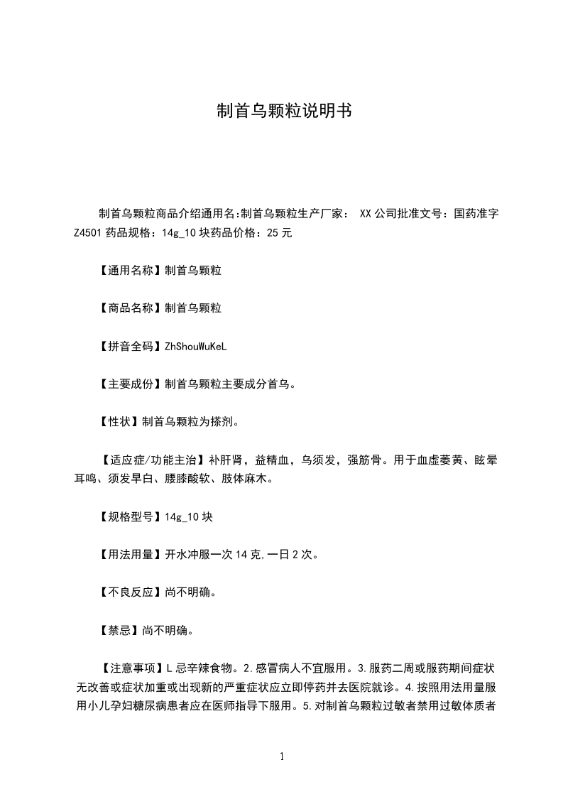 制首乌颗粒商品介绍通用名:制首乌颗粒生产厂家:XX公司批准文号:国药准字Z4501药品规格:14g_10块药品价格:25元