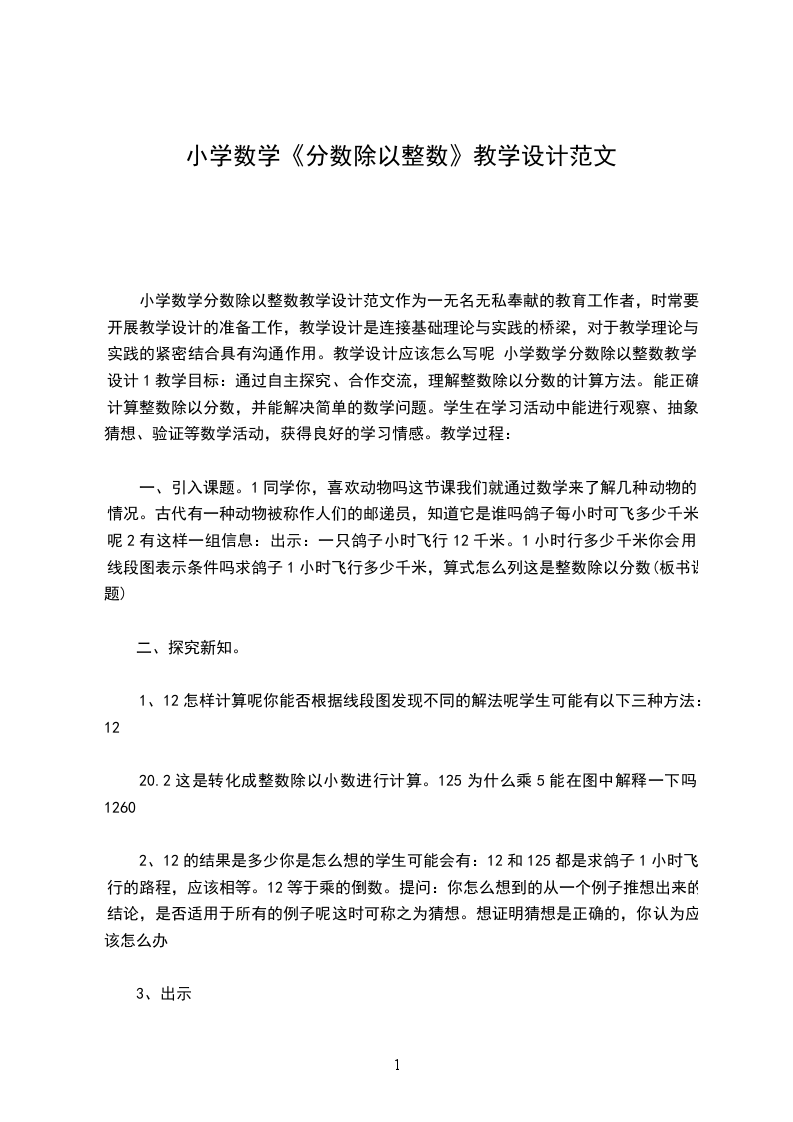 小学数学分数除以整数教学设计范文作为一无名无私奉献的教育工作者,时常要开展教学设计的准备工作,教学设计是连接基础理论与实践的桥梁,对于教学理论与实践的紧密结合具有沟通作用。教学设计应该怎么写呢 小学数学分数除以整数教学设计1教学目标:通过自主探究、合作交流,理解整数除以分数的计算方法。能正确计算整数除以分数,并能解决简单的数学问题。学生在学习活动中能进行观察、抽象、猜想、验证等数学活动,获得良好的学习情感。教学过程: