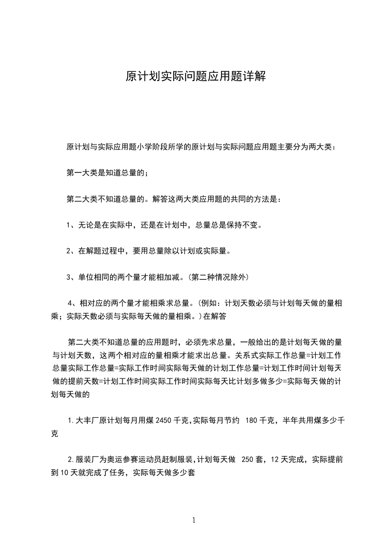 原计划与实际应用题小学阶段所学的原计划与实际问题应用题主要分为两大类: