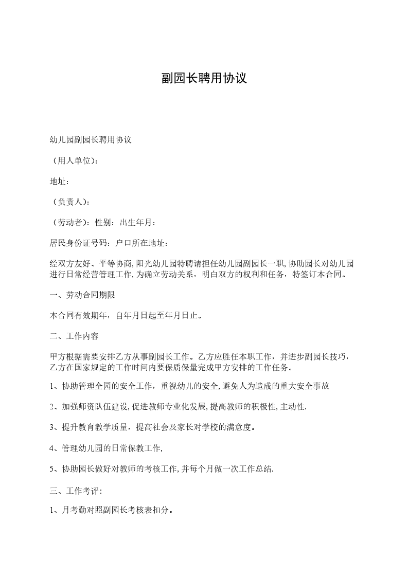 经双方友好、平等协商,阳光幼儿园特聘请担任幼儿园副园长一职,协助园长对幼儿园进行日常经营管理工作,为确立劳动关系,明白双方的权利和任务,特签订本合同。