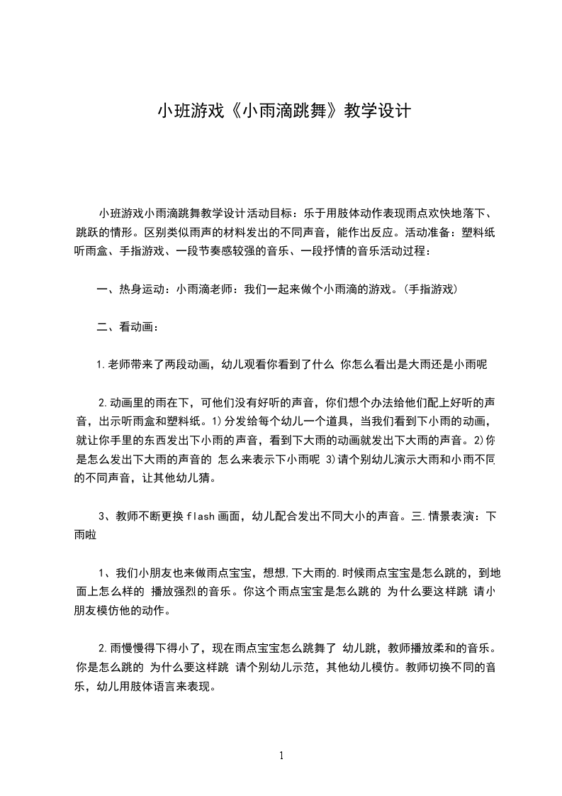 小班游戏小雨滴跳舞教学设计活动目标:乐于用肢体动作表现雨点欢快地落下、跳跃的情形。区别类似雨声的材料发出的不同声音,能作出反应。活动准备:塑料纸、听雨盒、手指游戏、一段节奏感较强的音乐、一段抒情的音乐活动过程: