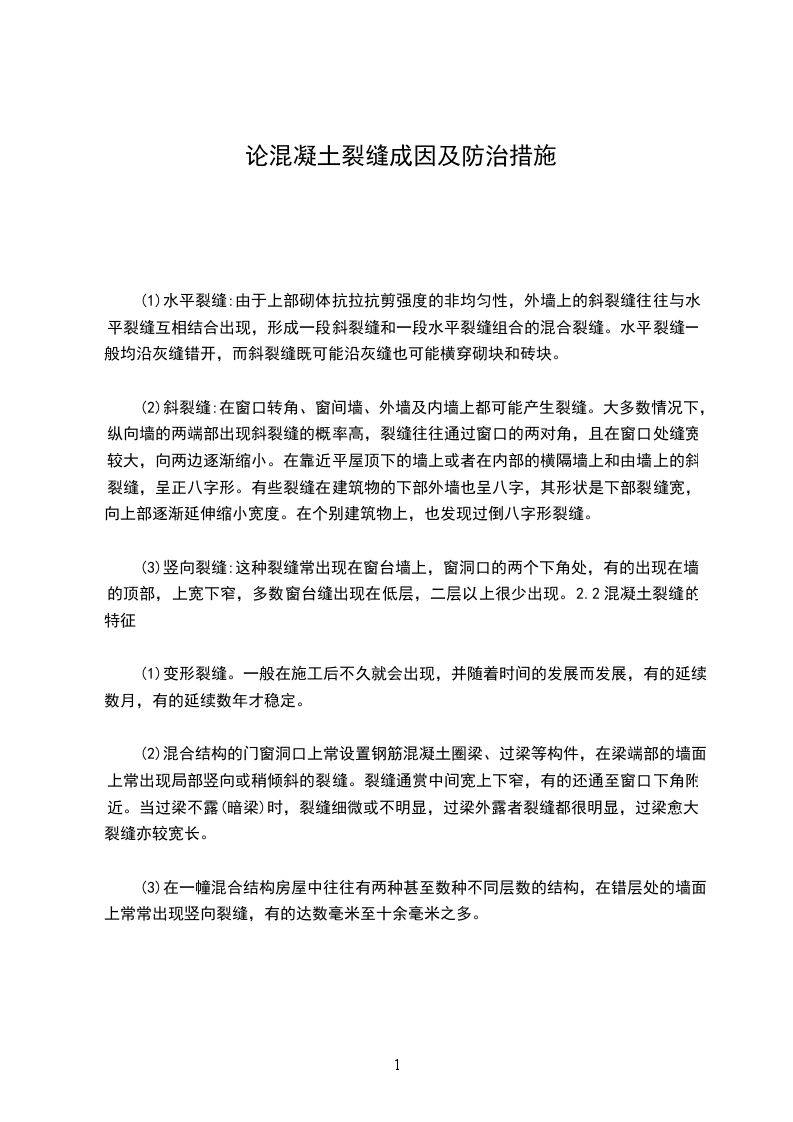 【2】,可以选择用粘补剂等将其涂抹平整;水泥用量要严格控制;合理设置钢筋的数量和位置;在相应的位置设置施工收缩缝;在对混凝土的养护期间,可以适当延长覆盖时间。2.3混凝土塑性坍落引起裂缝的控制要仔细选择集料的配级,做好混凝土的配合比设计,特别是要控制水灰比,采用适量的减水剂;施工时混凝既不能漏振也不能过振,防止混凝土泌水现象的发生,防止模板沉陷;如果发生这类裂缝,可在混凝土终凝以前重抹面压光,使裂缝闭合。2.4根底不均匀引起裂缝的控制根据地基条件及上部结构形式,采用合理的构造措施及设置沉降缝。2.5冰冻裂缝的控制在建筑物根底梁下填一定厚度的松散材料(炉渣)。2.6生锈导致的缝隙的控制提高混凝土的密实度和抗渗性,适当加大保护层的厚度。2.7碱骨料化学反响引起裂缝的控制碱骨料化学反响对结构件的耐久性影响极大,为了控制碱骨料的化学反响速度应选择优质骨料和低含碱量水泥,并提高混凝土的密实度和采用较低的水灰比。2.8改善工艺,减少收缩控制混凝土温度升高值:在混凝土硬化过程中,控制水泥水化热引起的温度升高值,其目的是为了减小在降温阶段的温度变化,从而可以对降低温度应力、防止裂缝起到根底性作用。延缓混凝土降温速率