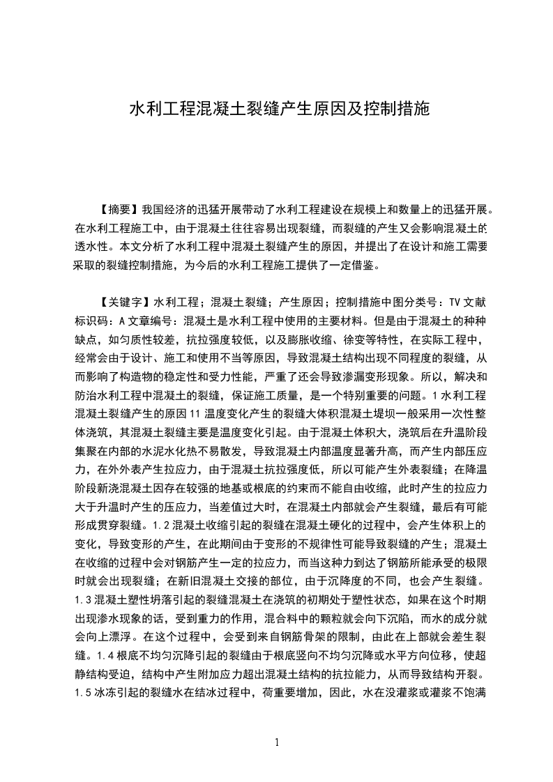 【摘要】我国经济的迅猛开展带动了水利工程建设在规模上和数量上的迅猛开展。在水利工程施工中,由于混凝土往往容易出现裂缝,而裂缝的产生又会影响混凝土的透水性。本文分析了水利工程中混凝土裂缝产生的原因,并提出了在设计和施工需要采取的裂缝控制措施,为今后的水利工程施工提供了一定借鉴。