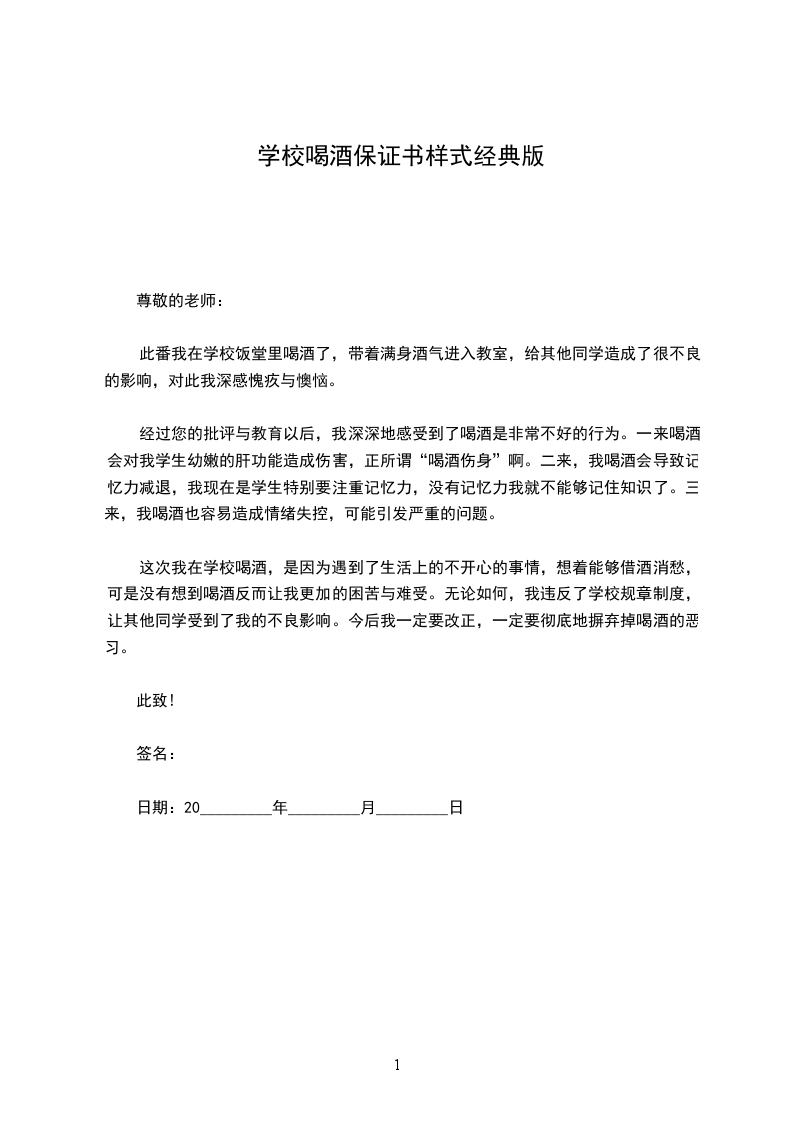 经过您的批评与教育以后,我深深地感受到了喝酒是非常不好的行为。一来喝酒会对我学生幼嫩的肝功能造成伤害,正所谓“喝酒伤身”啊。二来,我喝酒会导致记忆力减退,我现在是学生特别要注重记忆力,没有记忆力我就不能够记住知识了。三来,我喝酒也容易造成情绪失控,可能引发严重的问题。