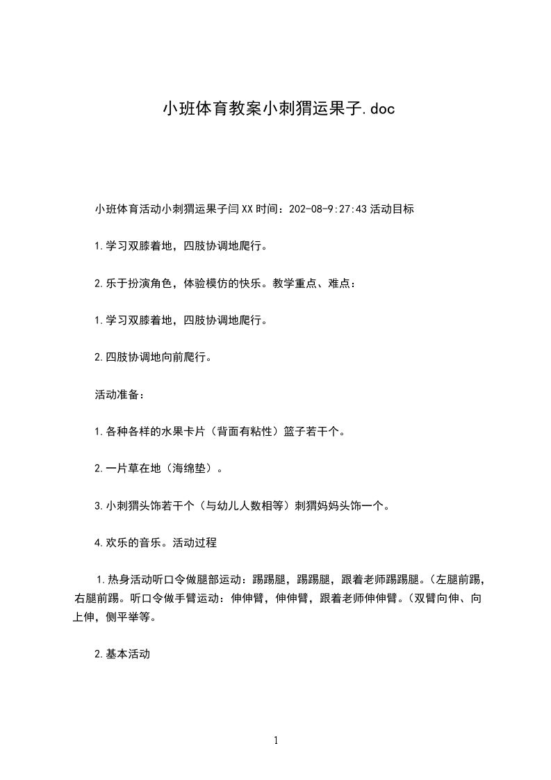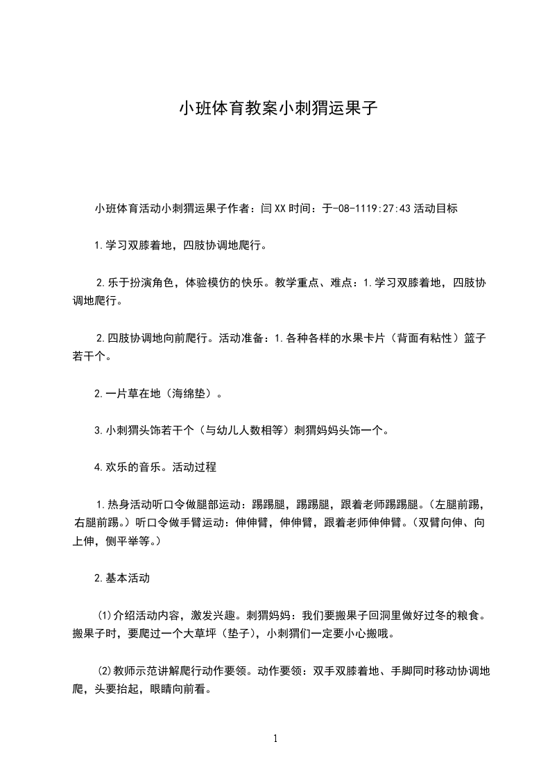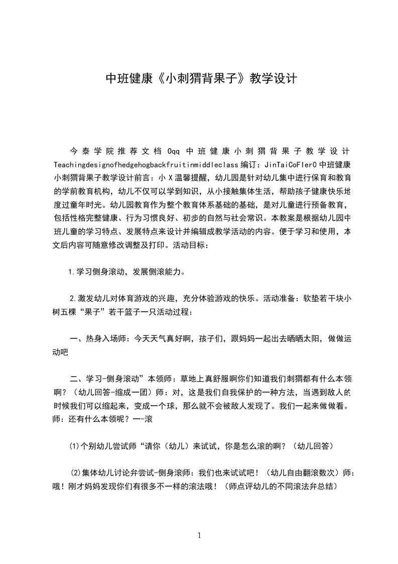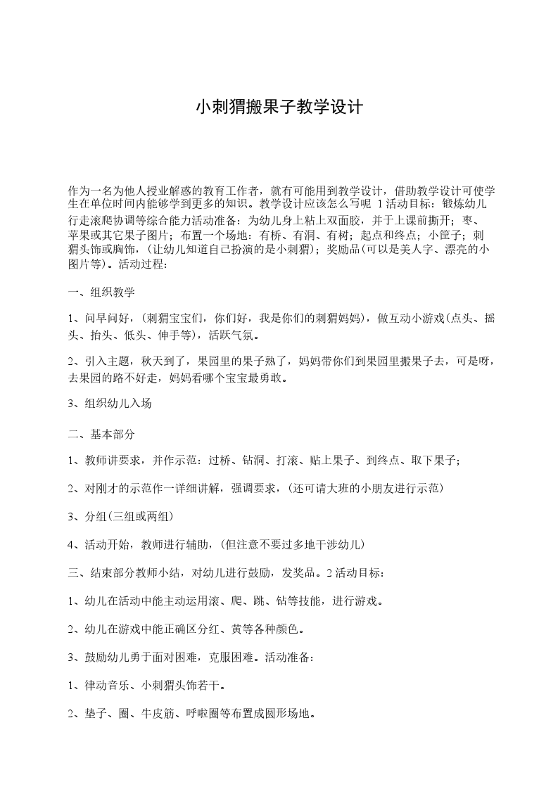 作为一名为他人授业解惑的教育工作者,就有可能用到教学设计,借助教学设计可使学生在单位时间内能够学到更多的知识。教学设计应该怎么写呢 1活动目标:锻炼幼儿行走滚爬协调等综合能力活动准备:为幼儿身上粘上双面胶,并于上课前撕开;枣、苹果或其它果子图片;布置一个场地:有桥、有洞、有树;起点和终点;小筐子;刺猬头饰或胸饰,(让幼儿知道自己扮演的是小刺猬);奖励品(可以是美人字、漂亮的小图片等)。活动过程: