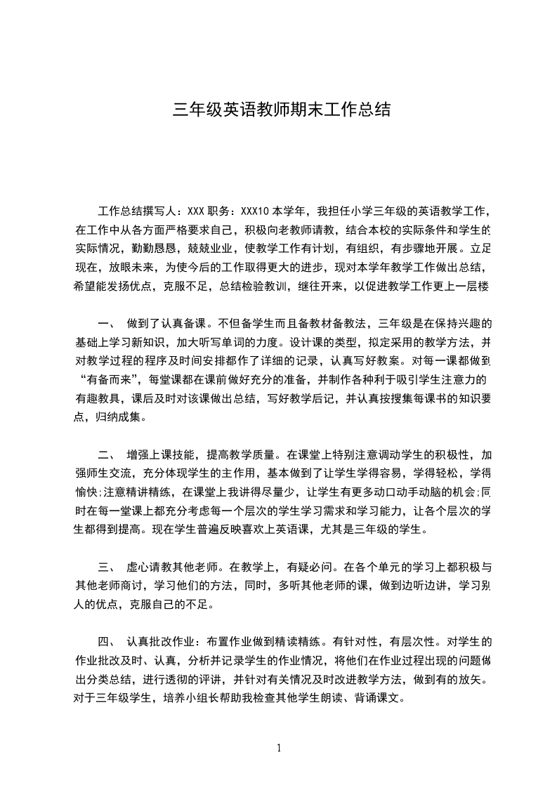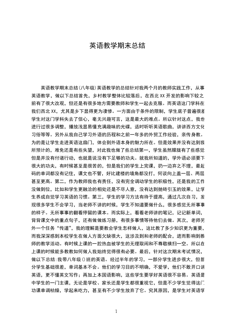 三、自身的学习鉴自己在小学英语教学方面没有经验,我抓紧一切机会向其他老师学习,用心收集有助小学英语课堂教学的各种游戏、活动。同时多听录音磁带,让自己的语音和语调标准。以上是我这学期在小学英语教学方面取得的成绩和经验,但也存在较多的不足,如课堂操作欠灵活,多媒体操作不熟练,尤其是后进生工作,由客观原因,做的不够,以致成绩不理想。在今后的教学工作中,我会努力填补自己在教学工作中不足,也会不耻下问,向其他老师学习,争取迈上一个新台阶。