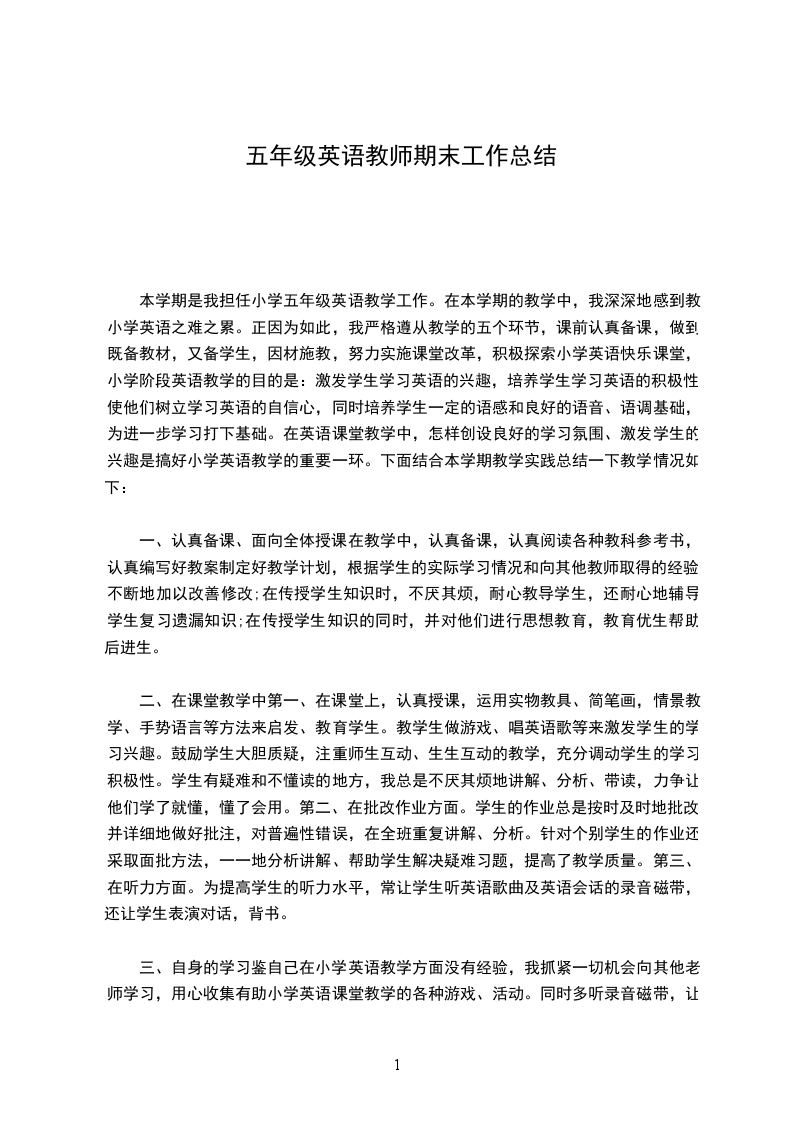 本学期我担任了五年级的英语教学,由孩子小,人数多,但学习英语兴趣较浓,因此,我对五年级英语教学工作也不敢怠慢,认真学习,深入研究教法,虚心向前辈学习。经过一个学期的努力,获得了很多宝贵的教学经验。以下是我在本学期的教学总结:教学就是教与学,两都是相互联系,不可分割的。有教者必然有学者。学生是被教的主体。因此,了解和分析学生情况,有针对地教。对教学成功与否至关重要。最初接解教学的时候,我还不懂得了解学生对教学的重要性,只是专心研究书本,教材想方设法令课堂生动,学生易接受。使学生在学中乐,乐中学,从而对英语这门学科产生更浓厚兴趣。教学中,备课是一个必不可少,十分重要的环节,备学生,又要备教法。备课不充分或者备得不好,会严重影响课堂气氛和积极性,曾有一位前辈对我说:备课备不好,倒不如不上课,否则就是白费心机。我明白到备课的重要性,因此,每天我都花费大量的时间在备课之上,认认真真钻研教材和教法,不满意就不收工。虽然辛苦,但事实证明是值得的。备课充分,能调动学生的积极性,上课效果就好。但同时又要有驾驭课堂的能力,因为学生在课堂上的一举一动都会直接影响课堂教学。因此上课一定要设法令学生投入,不让其分心这就很讲究方法了。上课内容丰富、现实。教态自然、讲课生动,难易适中照顾全部就自然能够吸引住学生。所以,老师每天都要有充足的精神,让学生感到一种自然气氛。这样,授课就事半功倍。回看自己的授课,我感到有点愧疚。因为有时我并不能很好地做到这点。当学生在课堂上无心自学,违反纪律时,我的情绪就受到影响,并且把这带到教学中,让原本正常的讲课受到冲击,发挥不到应有的水平,以致影响教学效果。我以后必须努力克服,研究方法,采取有力方法解决当中困难。因为英语的特殊情况,学生在不断学习中,会出现好差分化现象,差生面扩大,会严重影响班内的学习风气。因此,绝对不能忽视。为此,我制定了具体的计划和目标。对这部分同学进行有计划的辅导。英语是语言。因此除了课堂效果之外,还需要让学生多读多讲,多练,为此,在早读时,我坚持下班了解情况,发现问题及时纠正。课后发现作业问题也及时解决,及时讲清楚,让学生及时消化。另外,对部分不自觉的同学还采取强硬背诵等方式,提高他们的能力。经过一个学期的努力,期末考试就是一种考验。无论成绩高低,都体现了我在这学期的教学成果。我明白这并不是最重要的,重要的是本学期后如何自我提高,如何共同提高四个班的英语水平。因此,无论怎样辛苦,我会继续努力,多问,多想,多像前辈学习,争取进步。