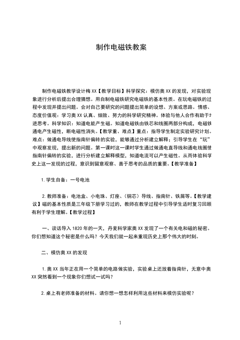 1.引入同学们,今天老师给大家带来了一样东西,请看这是什么 (磁铁)磁铁都有什么性质呢 (有磁性,吸铁)我们都知道磁铁有磁性,可以吸铁!大家再看这个,这是一个普通的铁钉,它能吸大头针吗,咱们来试试 (不能)我有办法让它也能够吸起大头针,仔细看好。怎么样,大头针被吸了起来。这个装置叫做电磁铁,今天这节课我们就一起来研究电磁铁。出示课题
