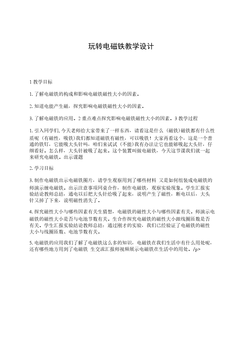 5.电磁铁的应用我们了解了电磁铁这么多的知识,电磁铁在我们生活中有什么用处呢,还有哪些地方用到了电磁铁 生交流汇报师视频展示电磁铁在生活中的用处。/p>