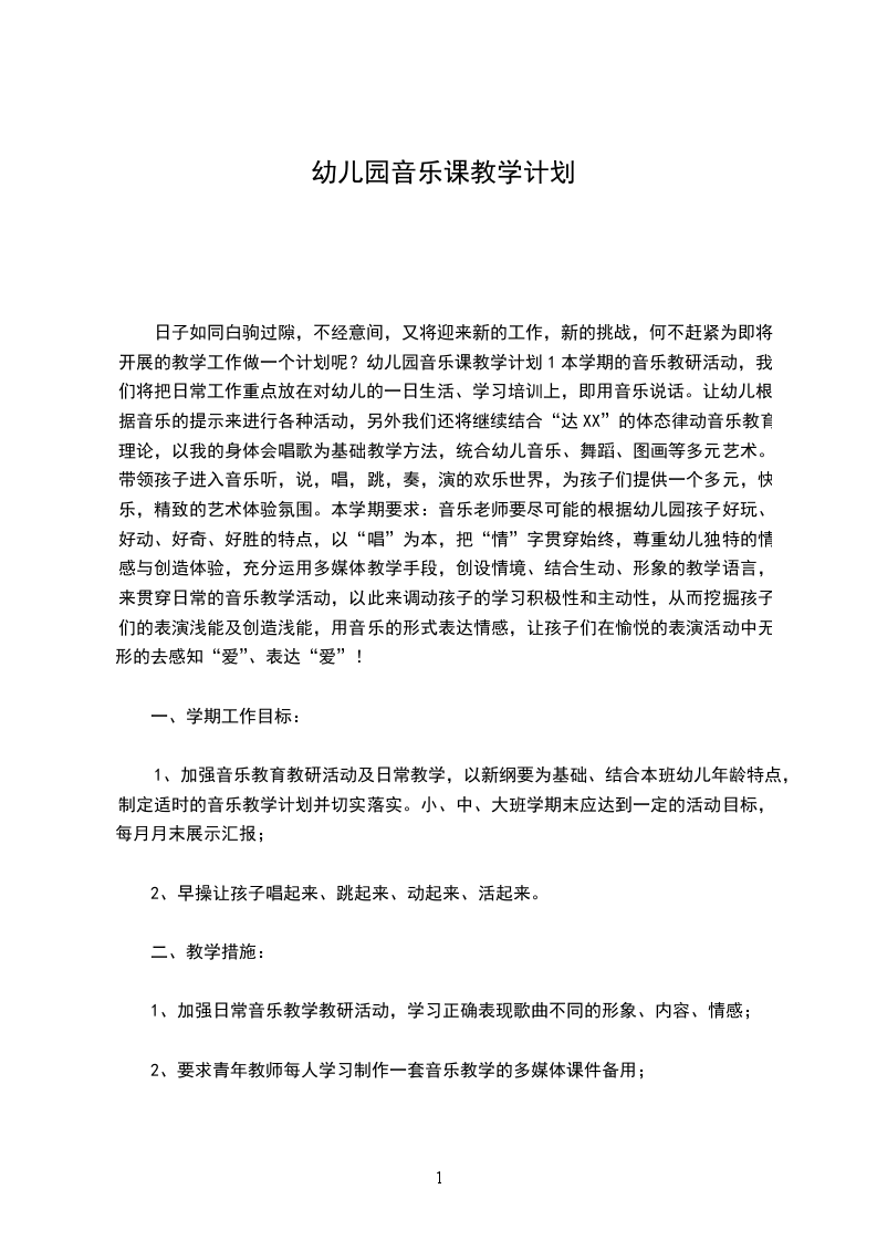 五、学期具体活动安排:二月:进班检查教师音乐语言熟练程度情况,暨乐曲弹唱(上课、整队、洗手、休息等曲目)三月:庆“三八”文艺小展演、进班听课四节(小、中班)四月:配合春季运动会、进班听课四节(大、学前班)五月:劳动最光荣歌咏比赛活动六月:庆“六一”文艺演出活动七月:教学成果汇报展示幼儿园音乐课教学计划2新的学期又开始了,在本学期的音乐教学计划中,我将结合新课程音乐教育论,改变传统的音乐教育模式,统合幼儿音乐、舞蹈等多元艺术。带领孩子进入听,说,唱,跳,演的欢乐世界,提供孩子一个多元,快乐,精致的艺术体验。