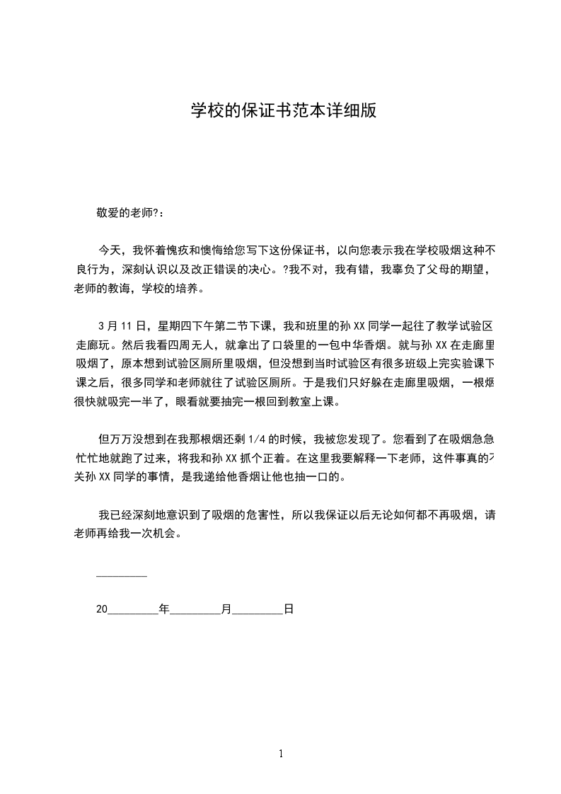 今天,我怀着愧疚和懊悔给您写下这份保证书,以向您表示我在学校吸烟这种不良行为,深刻认识以及改正错误的决心。?我不对,我有错,我辜负了父母的期望,老师的教诲,学校的培养。