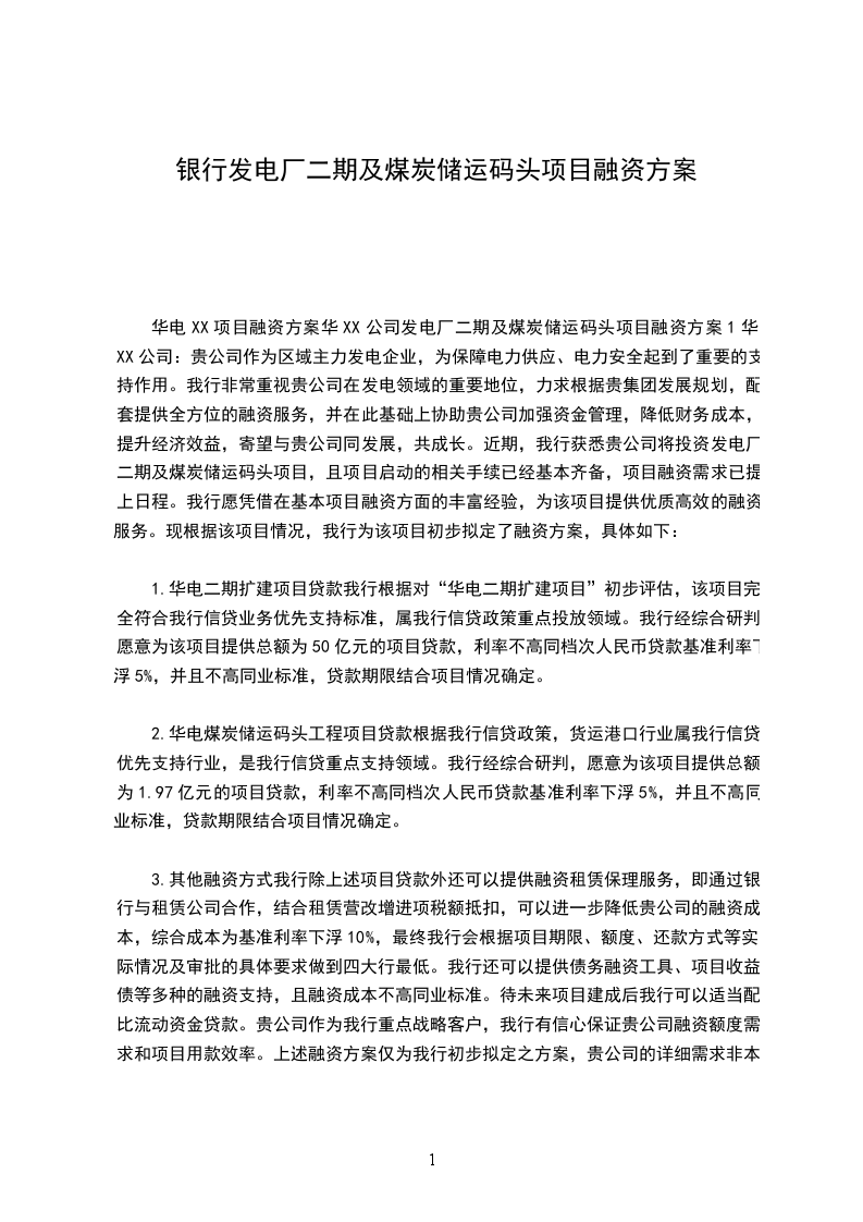 华电XX项目融资方案华XX公司发电厂二期及煤炭储运码头项目融资方案1华XX公司:贵公司作为区域主力发电企业,为保障电力供应、电力安全起到了重要的支持作用。我行非常重视贵公司在发电领域的重要地位,力求根据贵集团发展规划,配套提供全方位的融资服务,并在此基础上协助贵公司加强资金管理,降低财务成本,提升经济效益,寄望与贵公司同发展,共成长。近期,我行获悉贵公司将投资发电厂二期及煤炭储运码头项目,且项目启动的相关手续已经基本齐备,项目融资需求已提上日程。我行愿凭借在基本项目融资方面的丰富经验,为该项目提供优质高效的融资服务。现根据该项目情况,我行为该项目初步拟定了融资方案,具体如下: