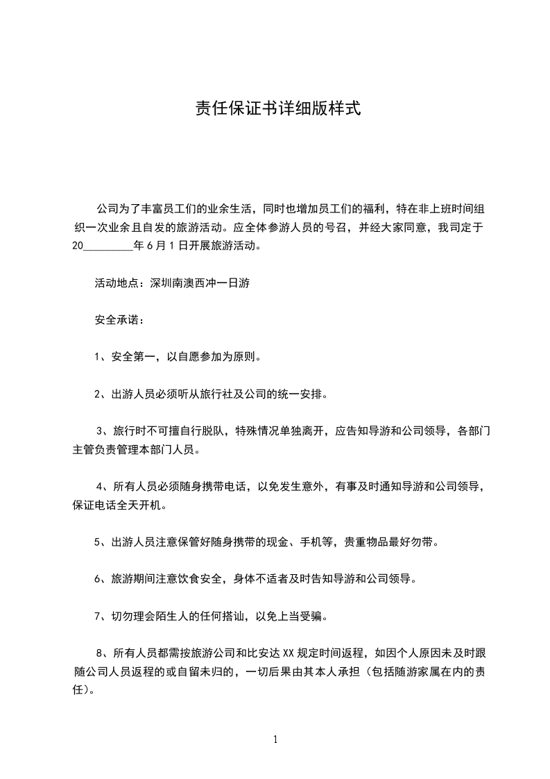 9、由于在出游期间人员不遵守以上承诺导致的人身、财产安全等损失,由参与者自行承担一切责任,与比安达XX无关,在出游期间因未按规定遵守的责任问题与康XX承担。特别注意事项:公司为了考虑给员工们更多的福利,特允许带家属参加旅游。