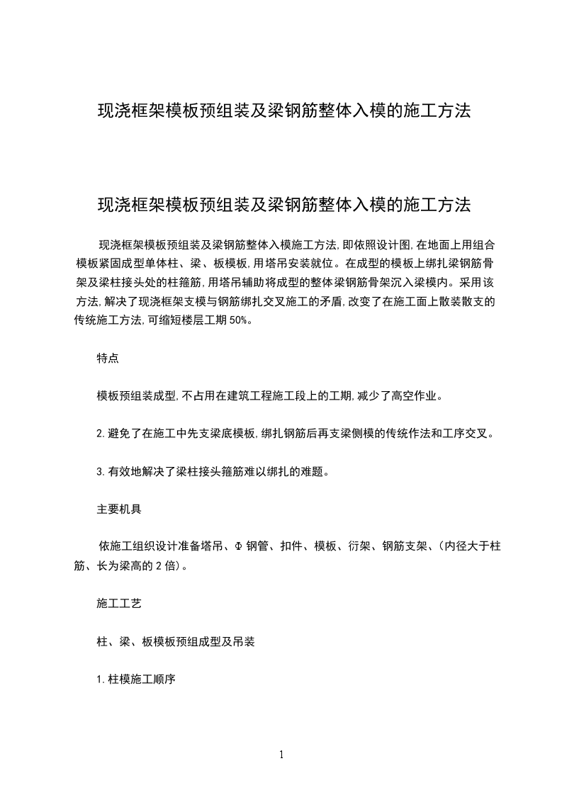 现浇框架模板预组装及梁钢筋整体入模施工方法,即依照设计图,在地面上用组合模板紧固成型单体柱、梁、板模板,用塔吊安装就位。在成型的模板上绑扎梁钢筋骨架及梁柱接头处的柱箍筋,用塔吊辅助将成型的整体梁钢筋骨架沉入梁模内。采用该方法,解决了现浇框架支模与钢筋绑扎交叉施工的矛盾,改变了在施工面上散装散支的传统施工方法,可缩短楼层工期50%。