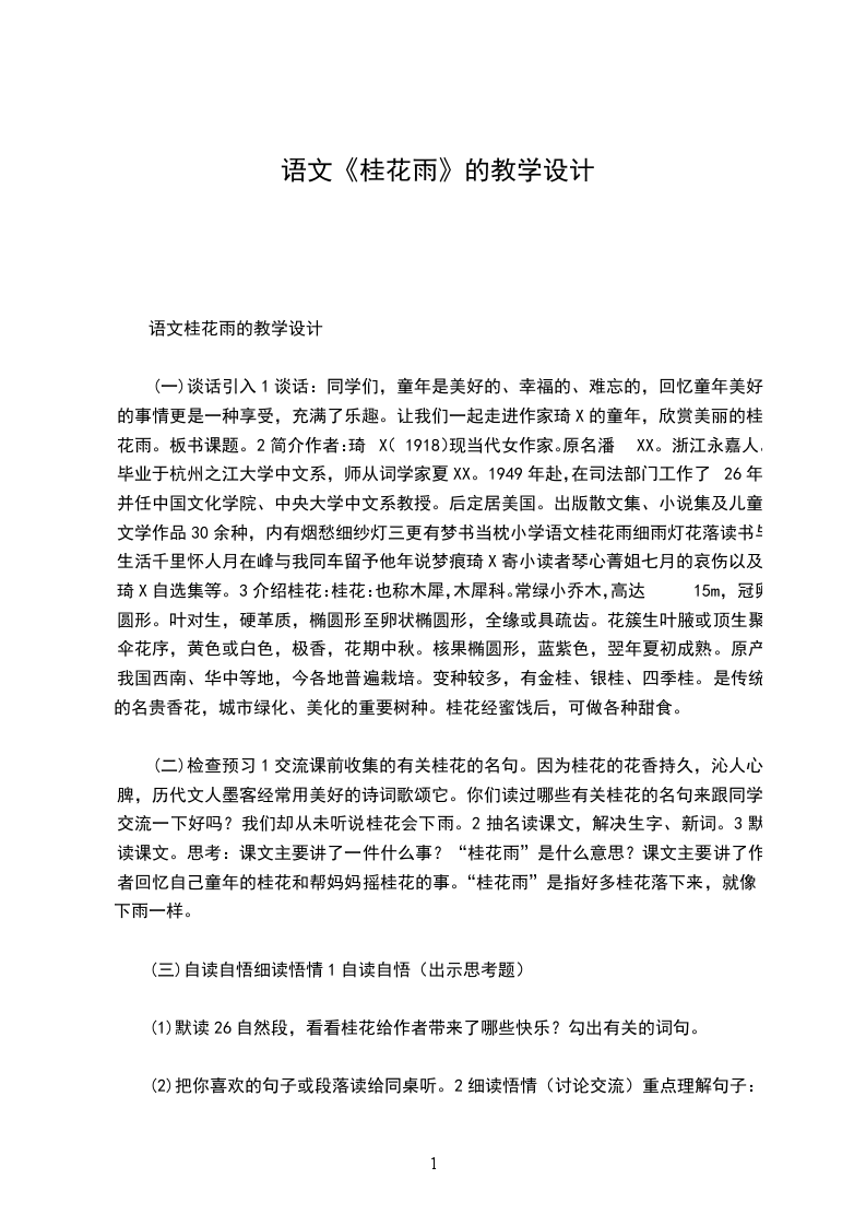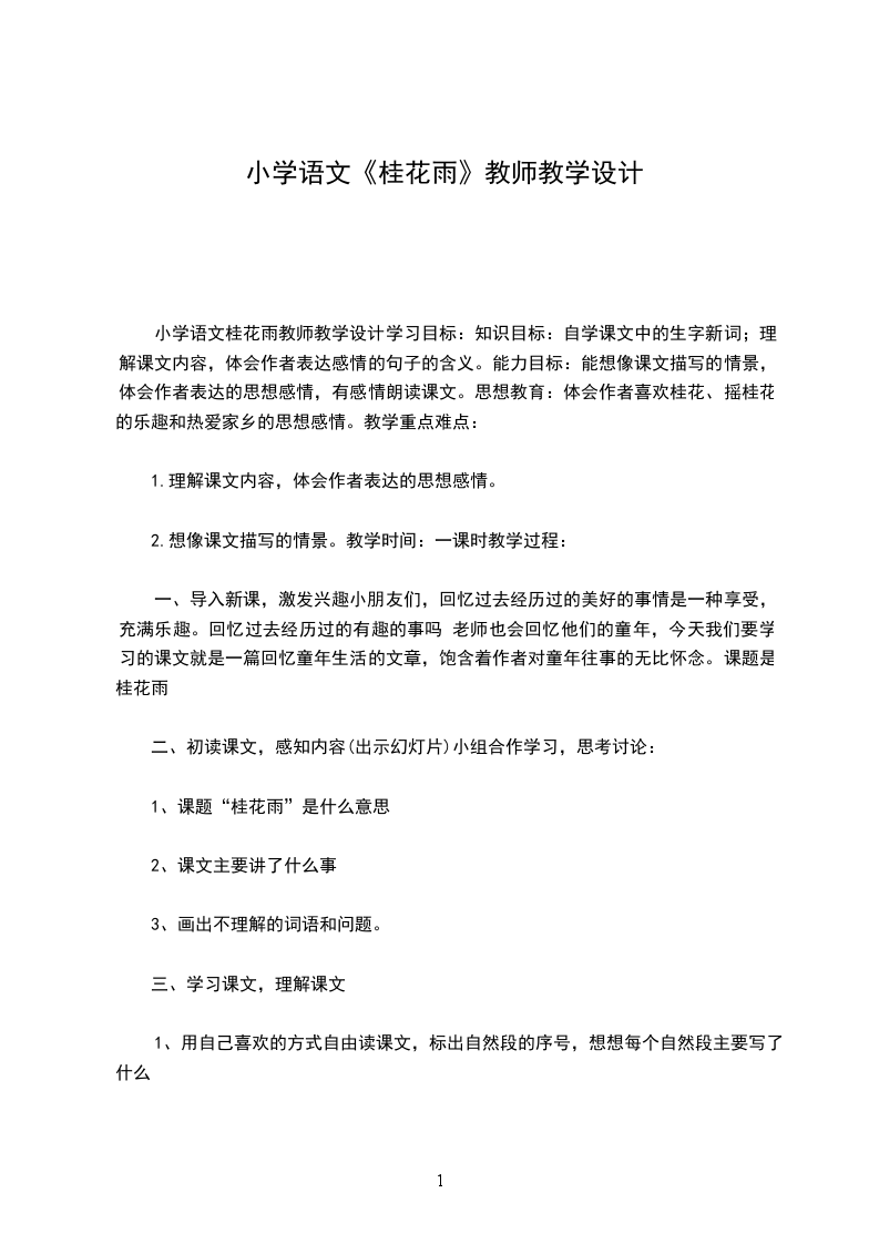 小学语文桂花雨教师教学设计学习目标:知识目标:自学课文中的生字新词;理解课文内容,体会作者表达感情的句子的含义。能力目标:能想像课文描写的情景,体会作者表达的思想感情,有感情朗读课文。思想教育:体会作者喜欢桂花、摇桂花的乐趣和热爱家乡的思想感情。教学重点难点:
