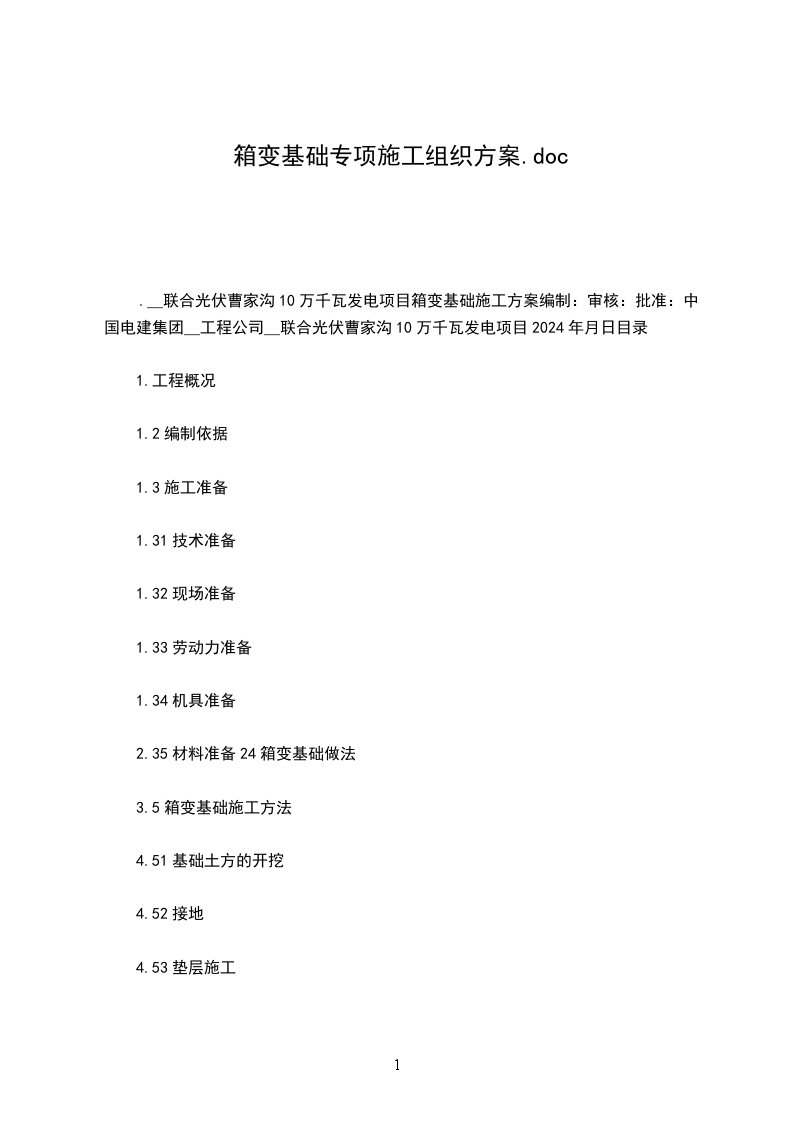 .__联合光伏曹家沟10万千瓦发电项目箱变基础施工方案编制:审核:批准:中国电建集团__工程公司__联合光伏曹家沟10万千瓦发电项目2024年月日目录