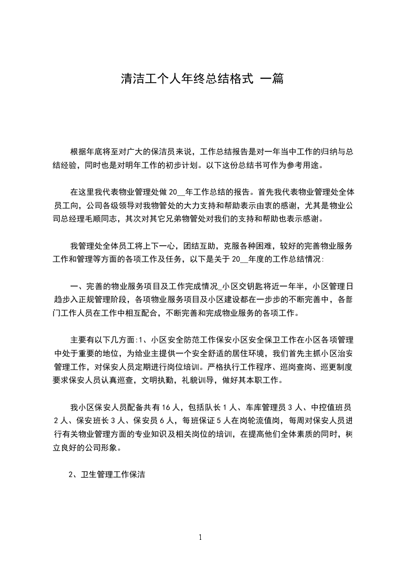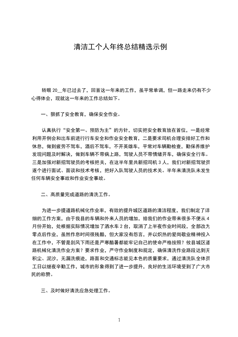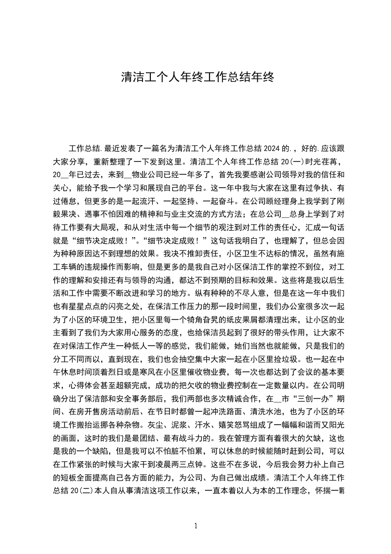 工作总结.最近发表了一篇名为清洁工个人年终工作总结2024的.,好的.应该跟大家分享,重新整理了一下发到这里。清洁工个人年终工作总结20(一)时光荏苒,20__年已过去,来到__物业公司已经一年多了,首先我要感谢公司领导对我的信任和关心,能给予我一个学习和展现自己的平台。这一年中我与大家在这里有过争执、有过倦怠,但更多的是一起流汗、一起坚持、一起奋斗。在公司顾经理身上我学到了刚毅果决、遇事不怕因难的精神和与业主交流的方式方法;在总公司__总身上学到了对待工作要有大局观,和从对生活中每一个细节的观注到对工作的责任心,汇成一句话就是“细节决定成败!”。“细节决定成败!”这句话我明白了,也理解了,但总会因为种种原因达不到理想的效果。我决不推卸责任,小区卫生不达标的情况,虽然有施工车辆的违规操作而影响,但是更多的是我自己对小区保洁工作的掌控不到位,对工作的理解和安排还有与领导的沟通,都达不到预期的目标和效果。这些将是我以后生活和工作中需要不断改进和学习的地方。纵有种种的不尽人意,但是在这一年中我们也有星星点点的闪亮之处,在保洁工作压力的那一段时间里,我们办公室很多次一起为了小区的环境卫生,把小区里每一个犄角旮旯的纸皮果屑都清理出来,让小区的业主看到了我们为大家用心服务的态度,也给保洁员起到了很好的带头作用,让大家不在对保洁工作产生一种低人一等的感觉,我们能做,她们当然也就能做,只是我们的分工不同而以,直到现在,我们也会抽空集中大家一起在小区里捡垃圾。也一起在中午休息时间顶着烈日或是寒风在小区里催收物业费,每一次也都达到了会议的基本要求,心得体会甚至超额完成,成功的把欠收的物业费控制在一定数量以内。在公司明确分出了保洁部和安全事务部后,我们两部也多次精诚合作,在__市“三创一办”期间、在房开售房活动前后、在节日时都曾一起冲洗路面、清洗水池,也为了小区的环境工作搬抬运挪各种杂物。灰尘、泥浆、汗水、嬉笑怒骂组成了一幅幅和谐而又阳光的画面,这时的我们是最团结、最有战斗力的。我在管理方面有着很大的欠缺,这也是我的一个缺陷,但是我可以不怕脏不怕累,可以休息的时候能随时赶到公司,可以在工作紧张的时候与大家干到凌晨两三点钟。这些不在多说,今后我会努力补上自己的短板全面提高自己各方面的能力,为公司、为自己做出成绩。清洁工个人年终工作总结20(二)本人自从事清洁这项工作以来,一直本着以人为本的工作理念,怀揣一颗真诚服务的心,全心全意做好本职工作。工作从摸索到熟悉,从茫然到自信,每前进一步,都离不开公司领导的关心和同事们的热情相助,谅解与支持。个人的力量是有限的,我们是一个团结的集体,个人所取得的小小成绩TOP100.排行应归功我们这支高素质的公司队伍,归功我们这群有热情、肯奉献的员工。自从干上这项工作,始终把耐得平淡、舍得付出、默默无闻作为自己的准则,工作中严谨、细致、脚踏实地、埋头苦干;严格遵守公司各项规章制度,尊重领导,服从领导,团结同志,谦虚谨慎,不断改进工作作风。我会以此为契机认真总结工作中的得失,好的继续坚持,不足之处切实得到改正,以更好地胜任这项工作。这一阶段的工作期间,清洁的日常工作主要靠的是公司领导的有效指挥。这一时期的工作,在大的事件处理上能积极向领导汇报,迅速采取措施,未出现严重错误,但在工作细节上还存在不少问题,好在有领导和同事及时指出并补救,均未产生严重后果。这一年的工作,也暴露了自身存在的一些问题,如在自身要求上还比较放松,对一些细节注意还不够,有待在今后的工作中予以改进。同时,希望能有机会学习、掌握更多技能,提高自己的水平。决心在岗位上,投入更多的时间、更大的热情,完成公司布置的各项工作,不辜负公司领导的期望。清洁工个人年终工作总结20(三)20__年马上过去,大家在盘点一年中收获的同时,又寄希望与新的未来。热门思想汇报不知不觉中,我在新的岗位上结束了一年的工作,现总结如下:在领导和全体同志的关怀、帮助、支持下,紧紧围绕保证公司卫生干净为中心工作,充分发挥岗位职能,不断改进工作方法,提高工作效率,以“服从领导、团结同志、认真学习、扎实工作”为准则,始终坚持高标准、严要求,始终把“安全第一”放在首位。严格执行“六大禁令”,坚决杜绝习惯性违章。较好地完成了各项工作任务。我始终把学习放在重要位置,努力在提高自身综合素质上下功夫。