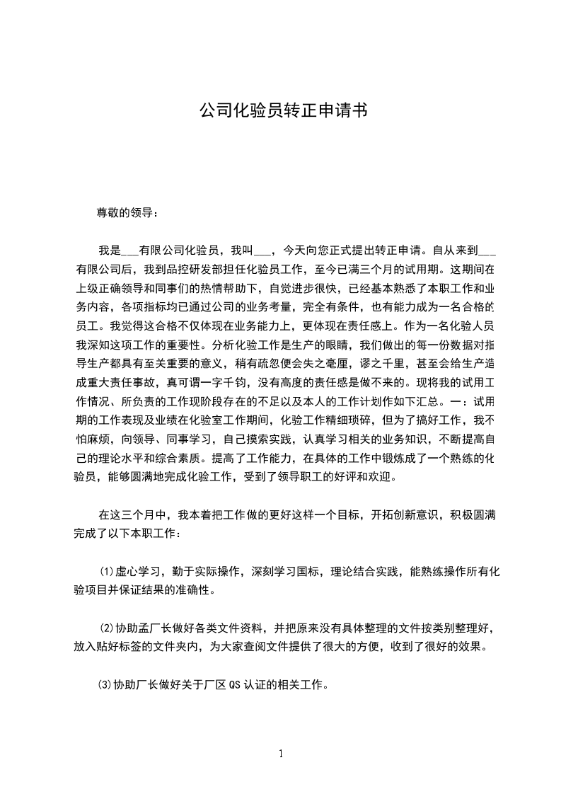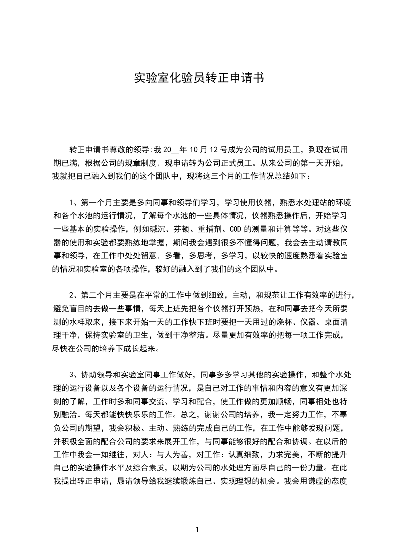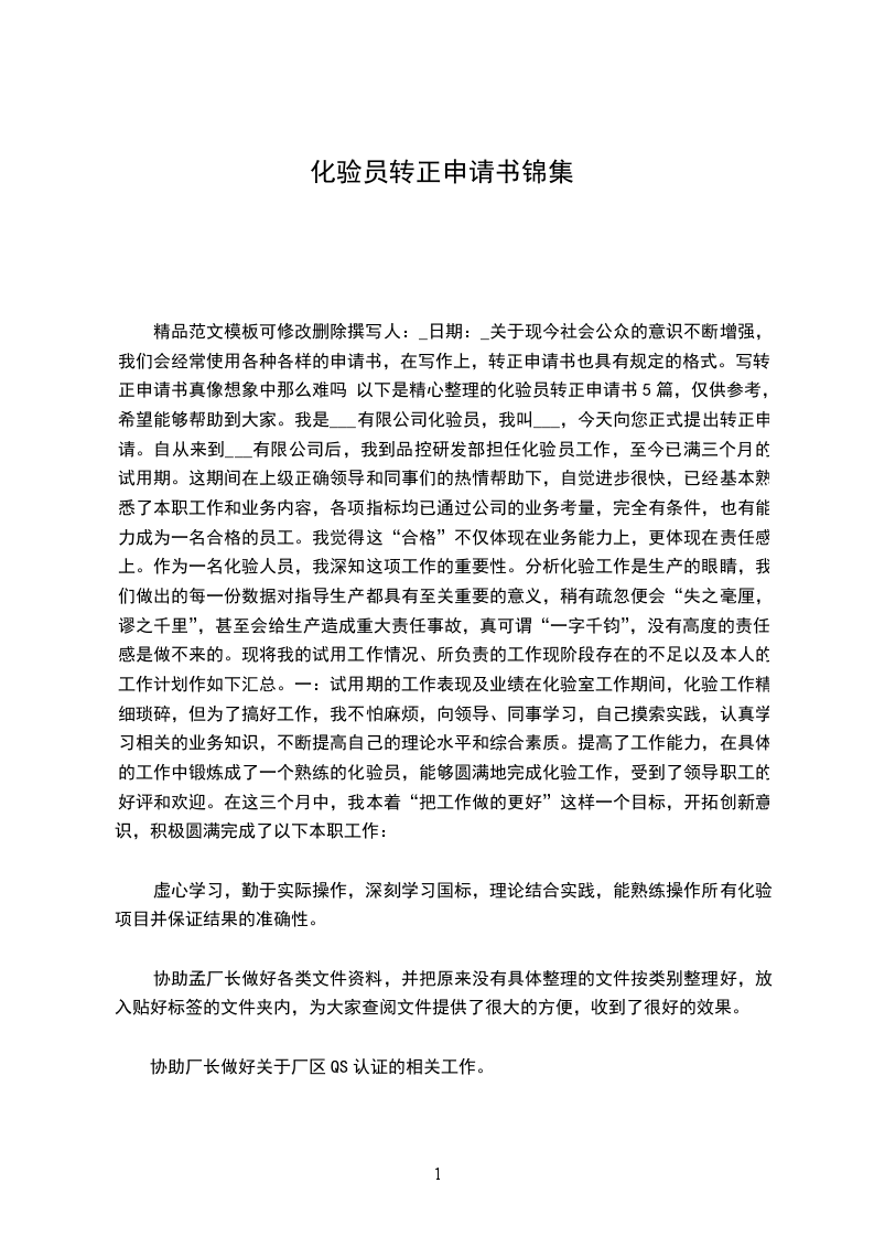 精品范文模板可修改删除撰写人:_日期:_关于现今社会公众的意识不断增强,我们会经常使用各种各样的申请书,在写作上,转正申请书也具有规定的格式。写转正申请书真像想象中那么难吗 以下是精心整理的化验员转正申请书5篇,仅供参考,希望能够帮助到大家。我是___有限公司化验员,我叫___,今天向您正式提出转正申请。自从来到___有限公司后,我到品控研发部担任化验员工作,至今已满三个月的试用期。这期间在上级正确领导和同事们的热情帮助下,自觉进步很快,已经基本熟悉了本职工作和业务内容,各项指标均已通过公司的业务考量,完全有条件,也有能力成为一名合格的员工。我觉得这“合格”不仅体现在业务能力上,更体现在责任感上。作为一名化验人员,我深知这项工作的重要性。分析化验工作是生产的眼睛,我们做出的每一份数据对指导生产都具有至关重要的意义,稍有疏忽便会“失之毫厘,谬之千里”,甚至会给生产造成重大责任事故,真可谓“一字千钧”,没有高度的责任感是做不来的。现将我的试用工作情况、所负责的工作现阶段存在的不足以及本人的工作计划作如下汇总。一:试用期的工作表现及业绩在化验室工作期间,化验工作精细琐碎,但为了搞好工作,我不怕麻烦,向领导、同事学习,自己摸索实践,认真学习相关的业务知识,不断提高自己的理论水平和综合素质。提高了工作能力,在具体的工作中锻炼成了一个熟练的化验员,能够圆满地完成化验工作,受到了领导职工的好评和欢迎。在这三个月中,我本着“把工作做的更好”这样一个目标,开拓创新意识,积极圆满完成了以下本职工作: