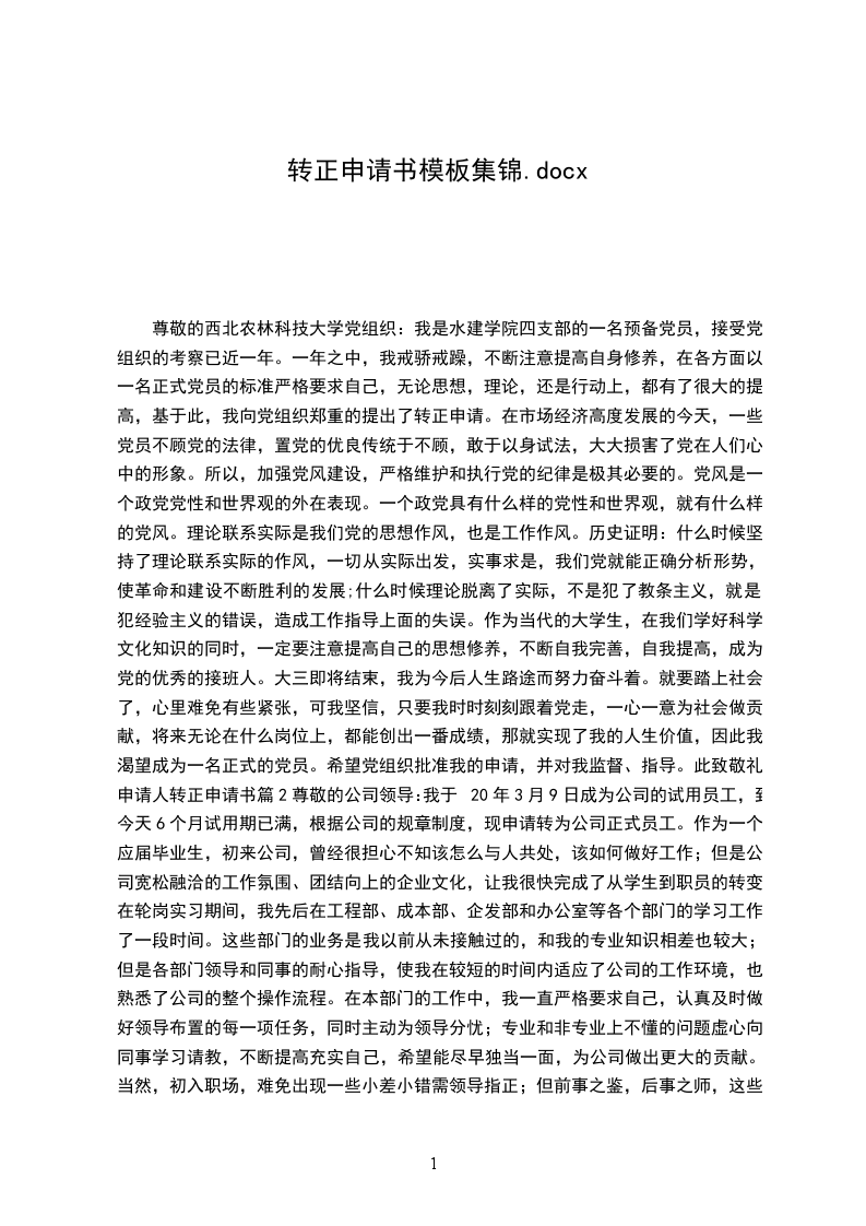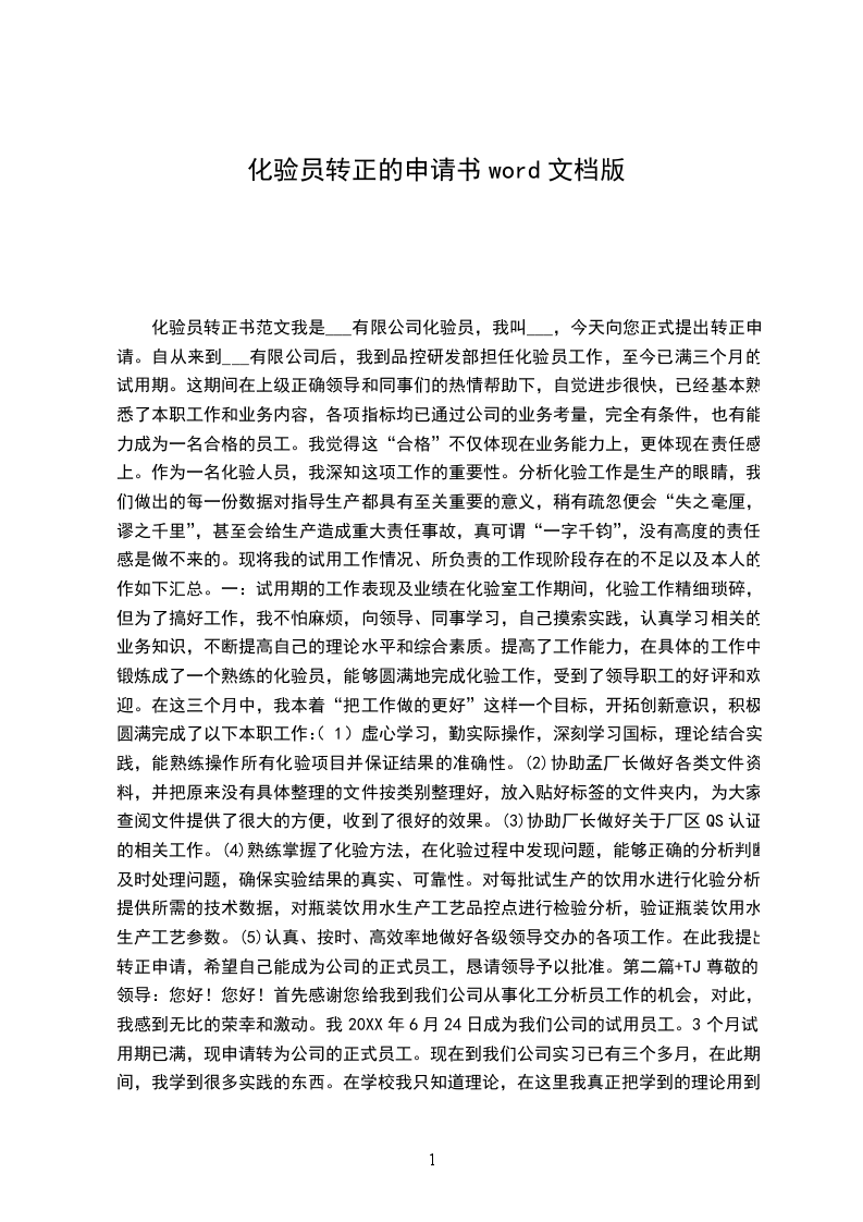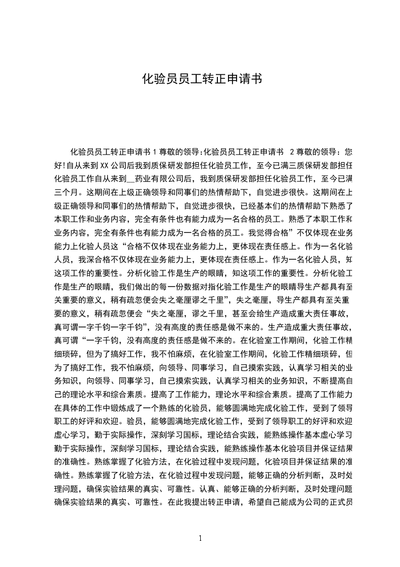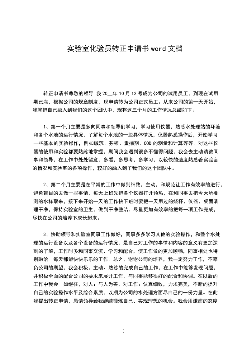 精品范文模板可修改删除撰写人:_日期:_关于现今社会公众的意识不断增强,我们会经常使用各种各样的申请书,在写作上,转正申请书也具有规定的格式。写转正申请书真像想象中那么难吗 以下是精心整理的化验员转正申请书5篇,仅供参考,希望能够帮助到大家。我是___有限公司化验员,我叫___,今天向您正式提出转正申请。自从来到___有限公司后,我到品控研发部担任化验员工作,至今已满三个月的试用期。这期间在上级正确领导和同事们的热情帮助下,自觉进步很快,已经基本熟悉了本职工作和业务内容,各项指标均已通过公司的业务考量,完全有条件,也有能力成为一名合格的员工。我觉得这“合格”不仅体现在业务能力上,更体现在责任感上。作为一名化验人员,我深知这项工作的重要性。分析化验工作是生产的眼睛,我们做出的每一份数据对指导生产都具有至关重要的意义,稍有疏忽便会“失之毫厘,谬之千里”,甚至会给生产造成重大责任事故,真可谓“一字千钧”,没有高度的责任感是做不来的。现将我的试用工作情况、所负责的工作现阶段存在的不足以及本人的工作计划作如下汇总。一:试用期的工作表现及业绩在化验室工作期间,化验工作精细琐碎,但为了搞好工作,我不怕麻烦,向领导、同事学习,自己摸索实践,认真学习相关的业务知识,不断提高自己的理论水平和综合素质。提高了工作能力,在具体的工作中锻炼成了一个熟练的化验员,能够圆满地完成化验工作,受到了领导职工的好评和欢迎。在这三个月中,我本着“把工作做的更好”这样一个目标,开拓创新意识,积极圆满完成了以下本职工作: