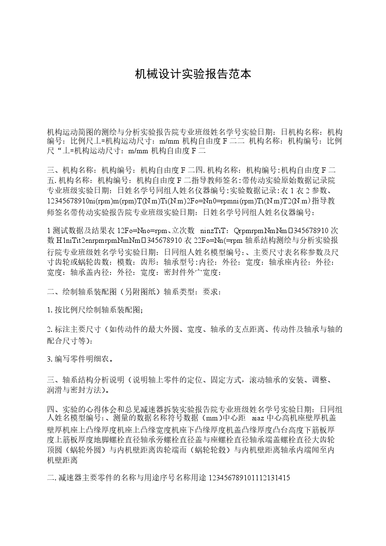 1测试数据及结果衣12Fo=Nno=rpm、立次数ninzTiT:QrpmrpmNmNm345678910次数H1niTit2enrpmrpmNmNm345678910衣22Fo=Nn(=rpm轴系结构测绘与分析实验报行院专业班级姓名学号实验日期:日同组人姓名模型编号:、主要尺寸表名称参数及尺寸齿轮或蜗轮齿数:模数:齿形:轴承型号:内径:外径:宽度:轴承座内径:外径:宽度:轴承盖内径:外径:宽度:密封件外宀宽度: