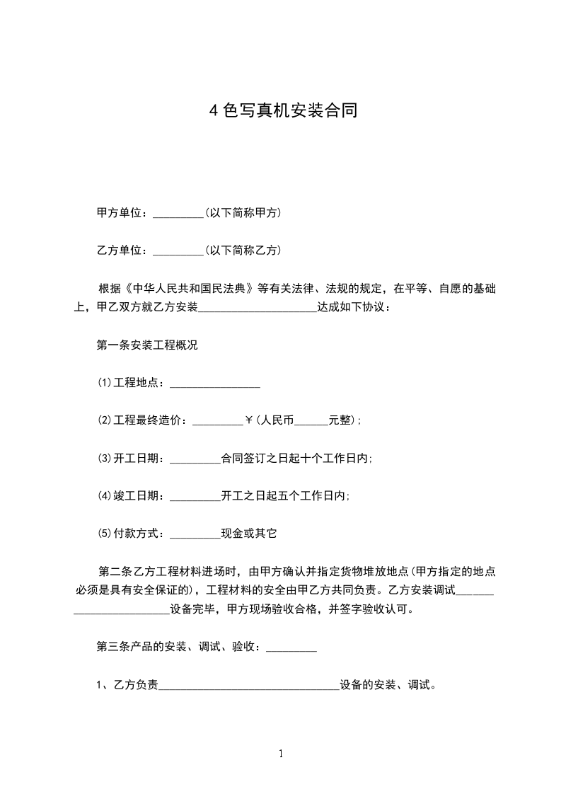 2、2卖方在自己的货物到现场后即刻派合适的人员到现场进行安装和调试工作。安装和调试时间为_________天。