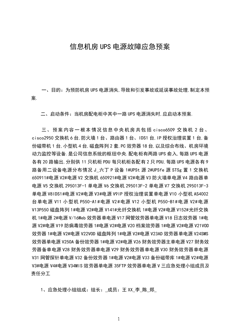 一、目的:为预防机房UPS电源消失,导致和引发事故或延误事故处理,制定本预案.