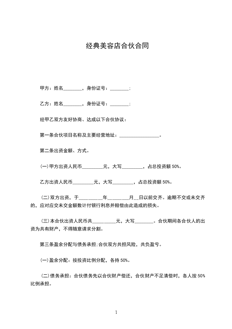 (一)甲方出资人民币_________元,大写_________,占总投资额50%。