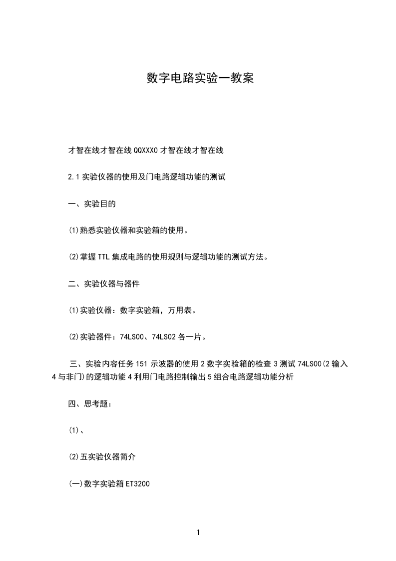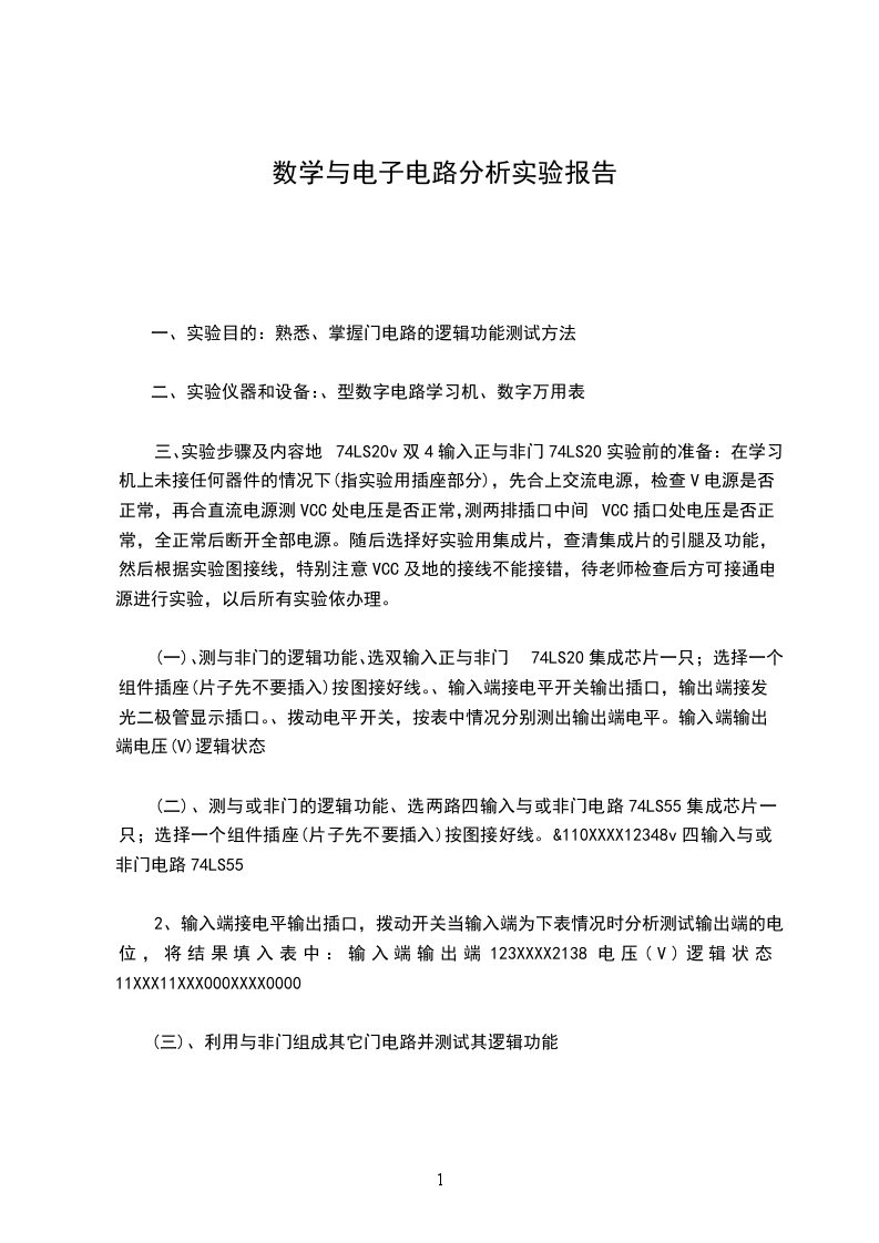 一、实验目的:熟悉、掌握门电路的逻辑功能测试方法