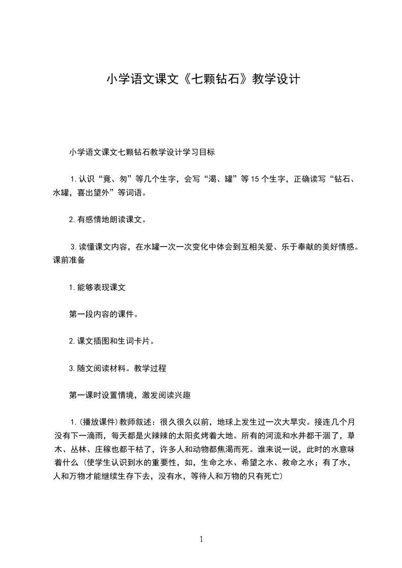 2.一天夜里,一个小姑娘意外地得到了一罐水,她会怎样用掉这罐水呢 (启发学生尽可能地展开各种想象,并说明理由。如,她会先自己喝上一口,滋润一下干裂的嘴唇和冒火的喉咙,然后再给自己的亲人喝;她会跑回家去,赶紧送给自己的爸爸妈妈、弟弟妹妹)同学们的猜想都有道理,今天我们要学的课文七颗钻石(板书课题)就是围绕这一罐水讲了许多意想不到的事情。让我们来读一读这篇课文吧!自读课文提出小组合作学习要求