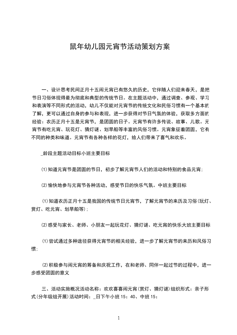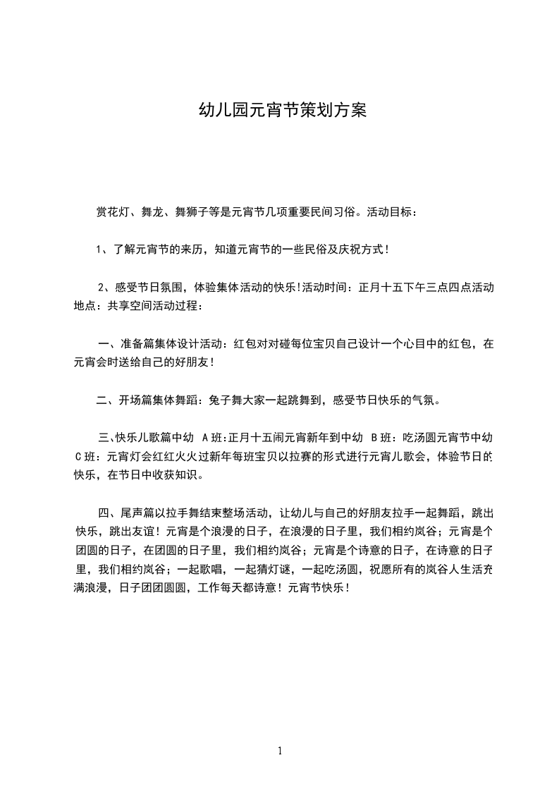 一、活动目标:元宵节是我国传统的重要节日之一,又称上元节、灯节民间正月十五闹元宵已有悠久的历史,它伴随人们迎来春天,是把节日习俗体现得最为彻底和典型的传统节日。组织本次活动,是通过家长和孩子的亲子交流、调查、参观、学习和制作等不同形式的活动,让幼儿不仅能对元宵节的传统文化和民俗习惯有一个基本的了解,更可以通过自身的参与和表现,进一步获得对节日气氛的体验,获取多方面的经验:如农历正月十五是元宵节,是团圆的日子。元宵节有许多传说、故事、儿歌。元宵节有吃元宵、玩花灯、猜灯谜、划旱船等丰富的风俗习惯。元宵象征着团圆,它有不同的种类和味道。元宵节有各种各样的花灯,给人们带来了喜气和欢乐。