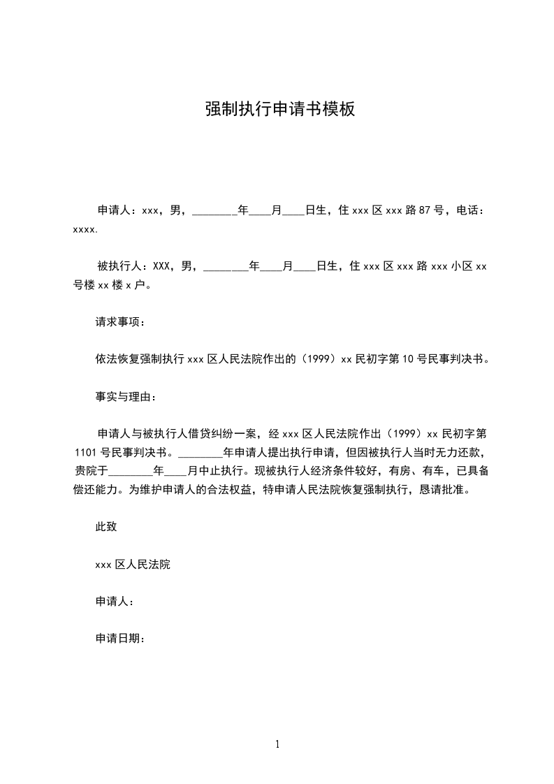 申请人与被执行人借贷纠纷一案,经xxx区人民法院作出(1999)xx民初字第1101号民事判决书。________年申请人提出执行申请,但因被执行人当时无力还款,贵院于________年____月中止执行。现被执行人经济条件较好,有房、有车,已具备偿还能力。为维护申请人的合法权益,特申请人民法院恢复强制执行,恳请批准。