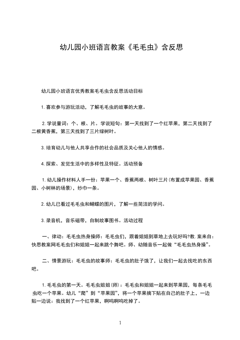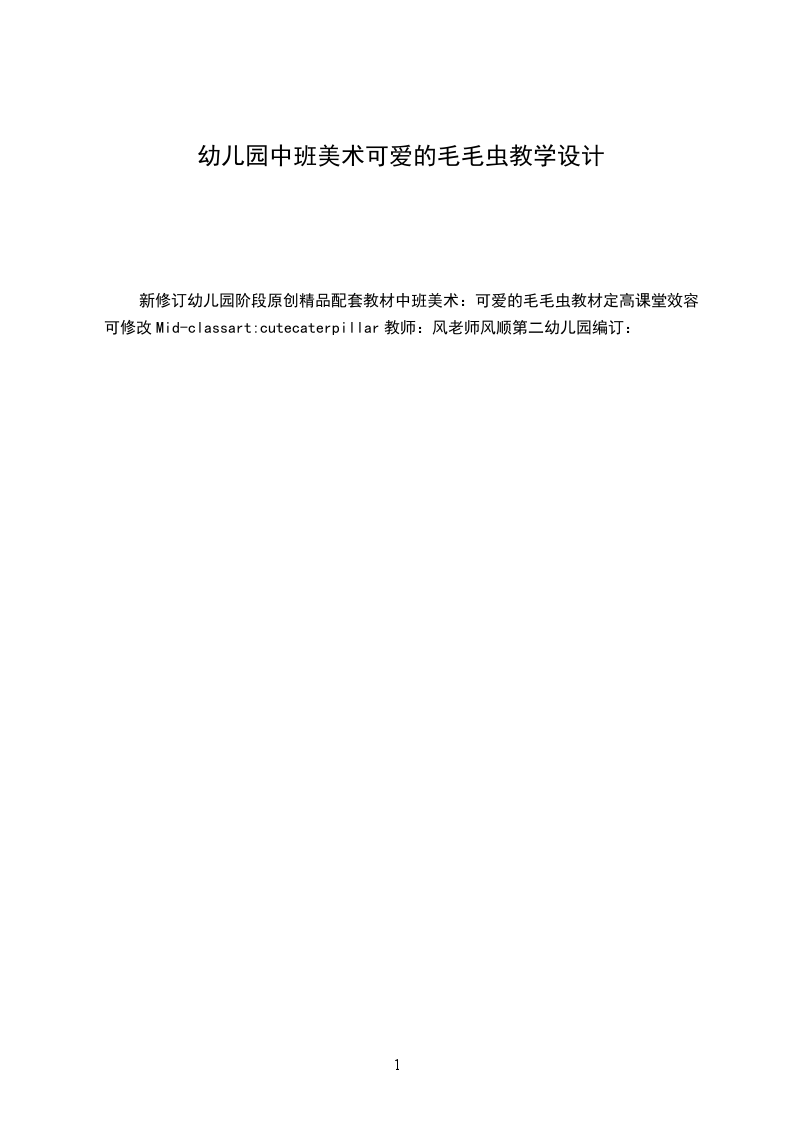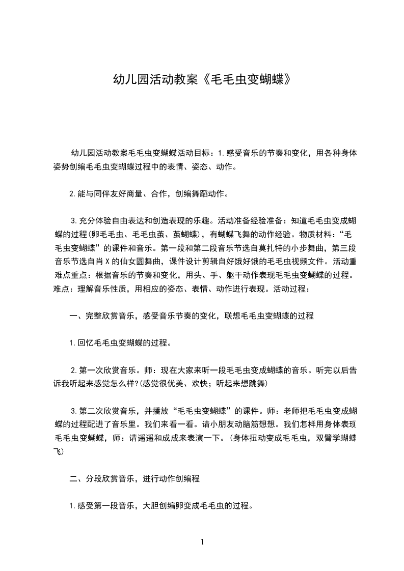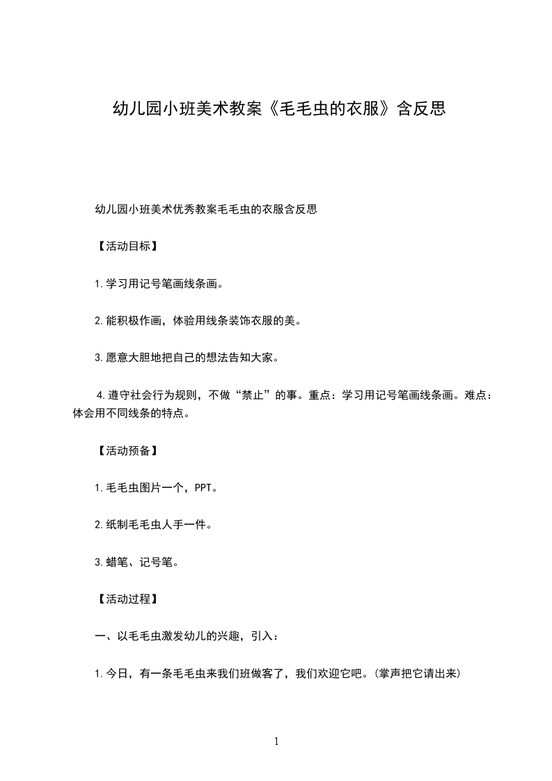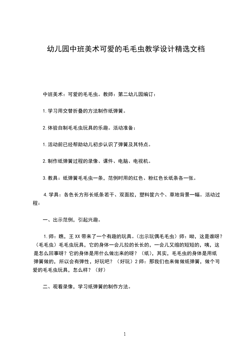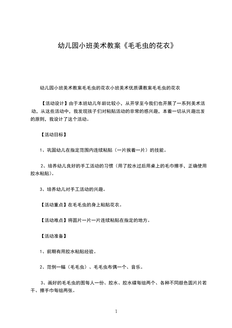 一、调动对毛毛虫的已有经验1.出示绒布玩具毛毛虫。谁来了?这只毛毛虫是怎么样的?你们用手来比比看。(引导幼儿注意到这是一条长长的毛毛虫。)(分析:让小班幼儿用动作比划“长”,利于加深幼儿对毛毛虫“身体长”的印象,为后面创作时表现长长的毛毛虫作准备。)2.这条毛毛虫可调皮了,它不停地把身体变来变去。(教师将毛毛虫扭成交叉状。)你们看,它的身体变成什么样了?你们来学学看。(教师用线条画出毛毛虫的交叉造型。)3.它又变成什么样了?(教师将毛毛虫的身体变成拱形。)这次,谁来学一学它的样子?(教师用线条画出拱形毛毛虫。)4.毛毛虫的头也会变。(教师将毛毛虫的头扭向后方。)你能发现毛毛虫现在想做什么吗?(引导幼儿发现:头向后的毛毛虫就好像在向后看。)5.如果我想让毛毛虫向地下钻,头应该怎么变呢?(分析:改变头的方向就可以改变毛毛虫的造型,幼儿如果能体会到这一关键点,便可以在后面黏贴时表现不同姿态的毛毛虫。同时,教师的提问可以提示幼儿根据头的方向想象毛毛虫所处的环境,如毛毛虫在向上吃树叶、在向下钻地洞、在草地上玩等,这样幼儿在后面黏贴时就能自发地添画毛毛虫的背景,使画面更丰富,更有吸引力。)