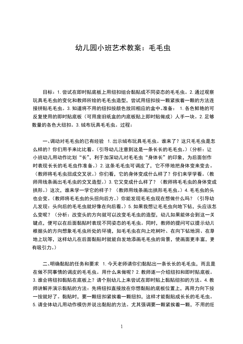 目标:1.尝试在即时贴底板上用纽扣组合黏贴成不同姿态的毛毛虫。2.通过观察玩具毛毛虫的变化和教师所绘的毛毛虫造型,尝试用纽扣按一颗紧挨着一颗的方法连接拼贴毛毛虫。3.知道将不用的纽扣按颜色放回相应的盒中。准备:1.各色鲜艳的可反复使用的即时贴底板(可用废旧纸盒的内底板贴上即时贴做成)人手一块。2.足够数量的各色大纽扣。3.绒布玩具毛毛虫。过程: