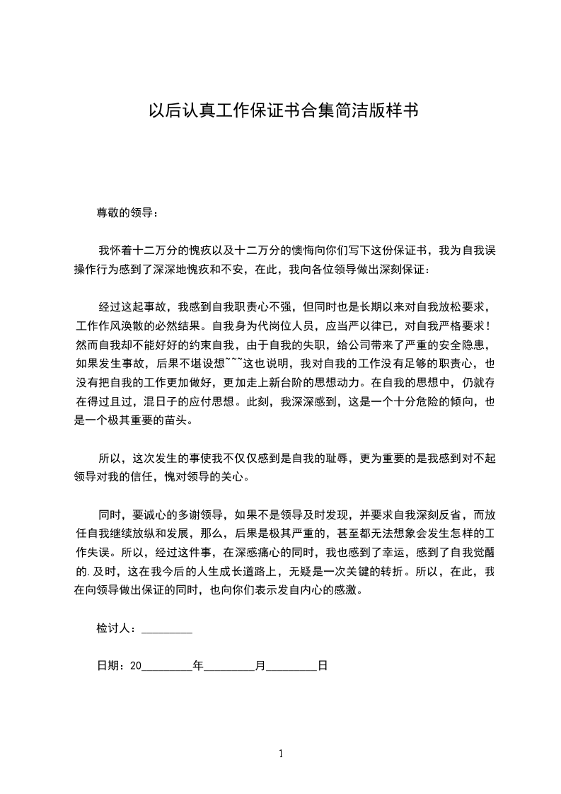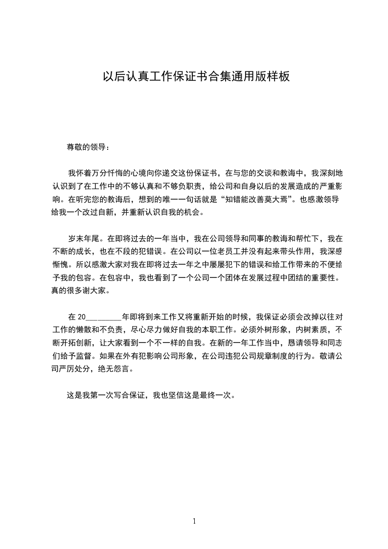 在20_________年即将到来工作又将重新开始的时候,我保证必须会改掉以往对工作的懒散和不负责,尽心尽力做好自我的本职工作。必须外树形象,内树素质,不断开拓创新,让大家看到一个不一样的自我。在新的一年工作当中,恳请领导和同志们给予监督。如果在外有犯影响公司形象,在公司违犯公司规章制度的行为。敬请公司严厉处分,绝无怨言。
