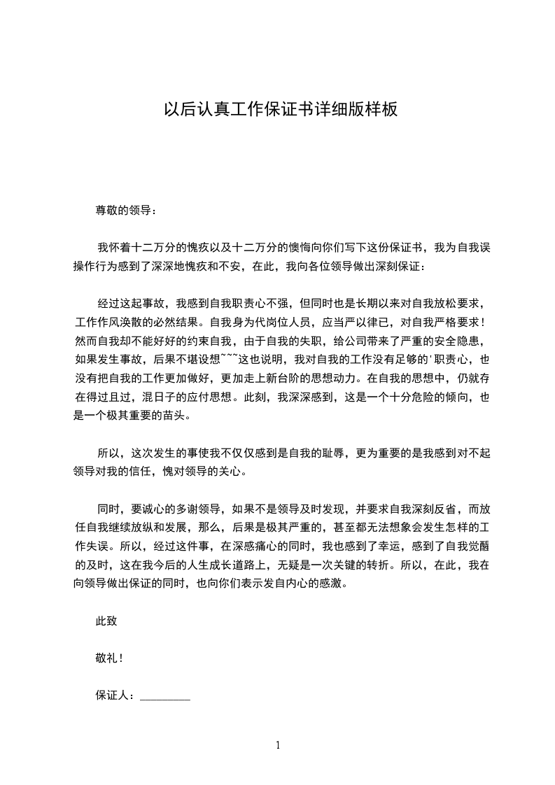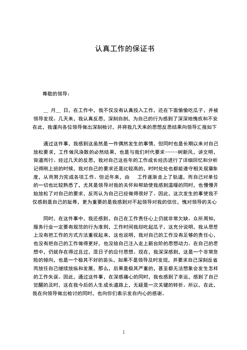 我怀着万分忏悔的心境向你递交这份保证书,在与您的交谈和教诲中,我深刻地认识到了在工作中的不够认真和不够负职责,给公司和自身以后的发展造成的严重影响。在听完您的教诲后,想到的唯一一句话就是“知错能改善莫大焉”。也感激领导给我一个改过自新,并重新认识自我的机会。