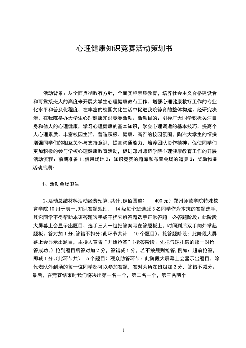 2、活动总结材料活动经费预算:共计:肆佰圆整(400元)郑州师范学院特殊教育学院10月于表一:知识答题规则:14级每个班选派3名同学作为本班的答题选手,其它同学不得帮助本班答题选手或干扰它班答题选手正常答题。必答题阶段:此阶段大屏幕上会显示岀题目,选手三人一组把答案写在答题板上,时间到后双手向外举起题板。答对加1分,答错不扣分(此环节共计10个题目)。抢答题阶段:此阶段大屏幕上会显示出题目,主持人宣告“开始抢答”(抢答阶段:先把气球扎破的那一对抢答成功,)抢到题目后答对加2分,答错减1分,若不按规则抢答,例如:超前抢答,即减1分。(此环节共计5个题目)观众助答环节:此阶段大屏幕上会显示出题目。除代表队外到场的每一位同学都可以参加答题,答对为所在班级加2分,答错不减分。最后,在竞赛结朿时我们将决出第一名一个,第二名一个,第三名两个。