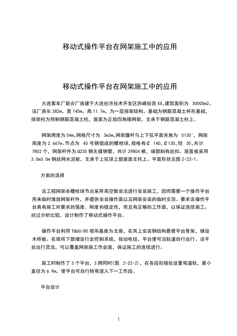 该工程网架各螺栓球节点采用高空散装法进行安装施工,因而需要一个操作平台用来临时堆放网架杆件,并提供安装操作面以及网架安装的临时支顶。要求该操作平台具有施工所要求的强度、刚度和稳定性,而且有足够的工作面,以保证连续施工。经过分析比较,设计制作了移动式操作平台。